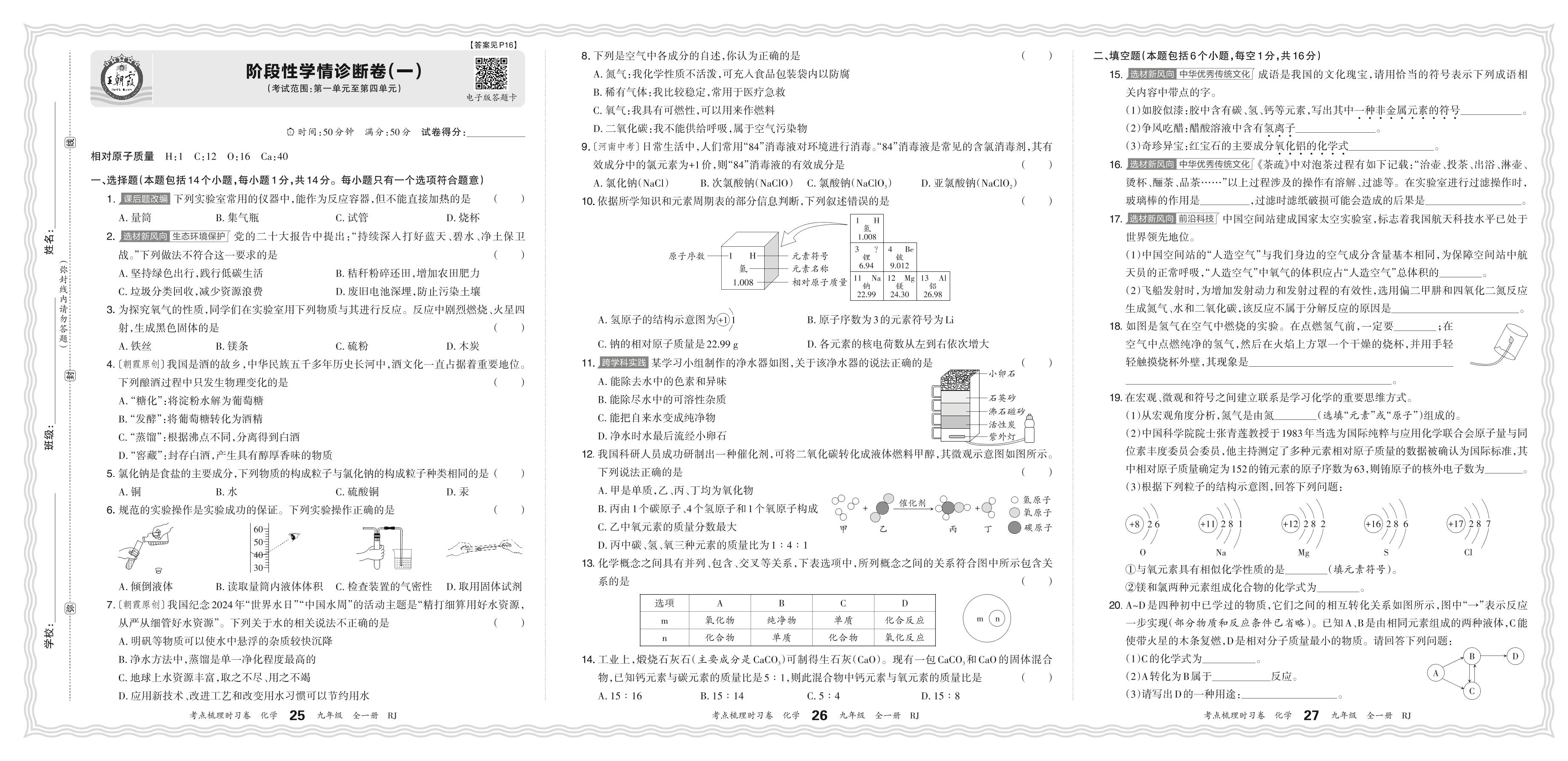 2024上册九年级化学人教版 阶段性学情诊断卷(一)