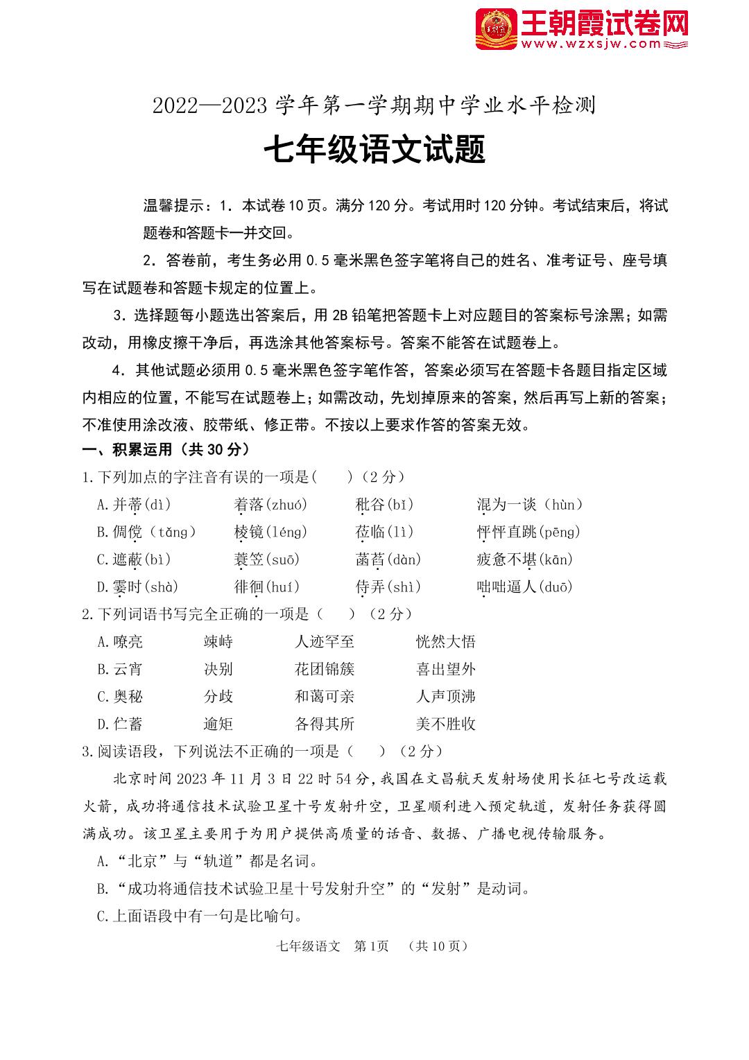 山东省滨州市无棣县2023-2024学年第一学期期中学业水平检测七年级语文(人教版)