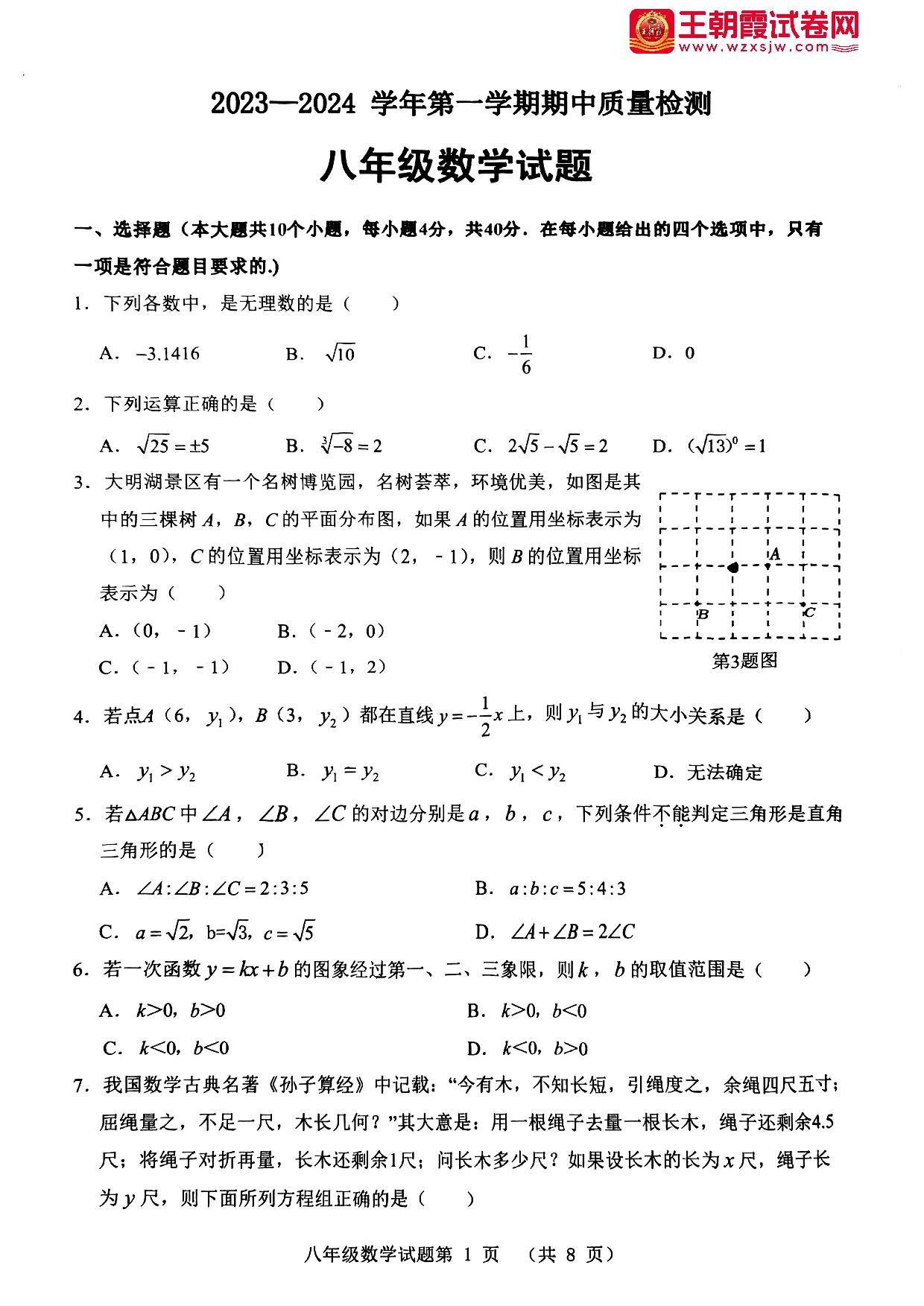 山东省济南市历城区2023-2024学年第一学期期中质量检测八年级数学(北师版)