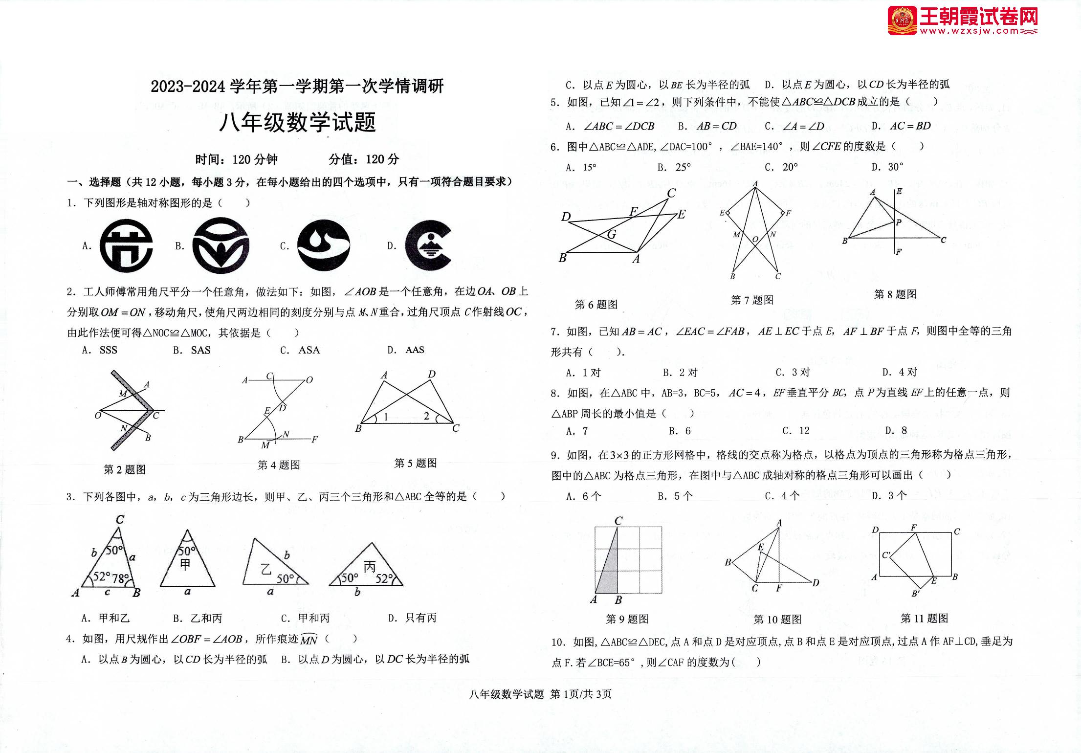 山东省聊城市运河联盟联考2023-2024学年第一学期第一次学情调研(月考)八年级数学(青岛版)
