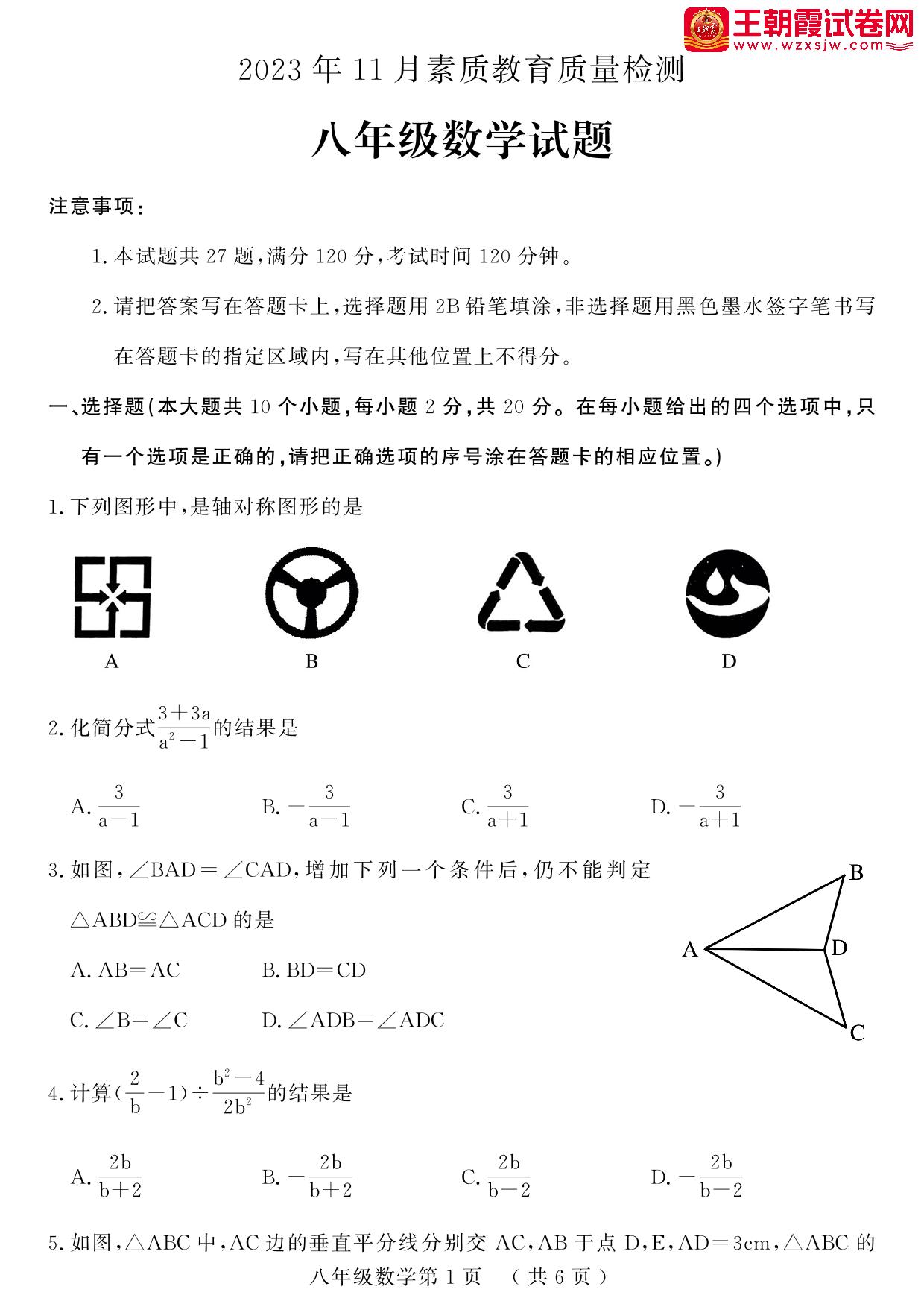 山东省菏泽市曹县2023-2024学年上学期期中素质教育质量检测八年级数学(青岛版)