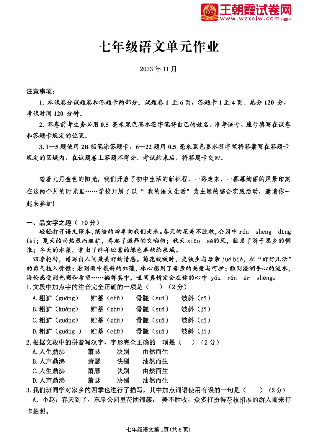 山东省临沂市沂水县2023-2024学年上学期期中阶段学业质量检测七年级语文(人教版)