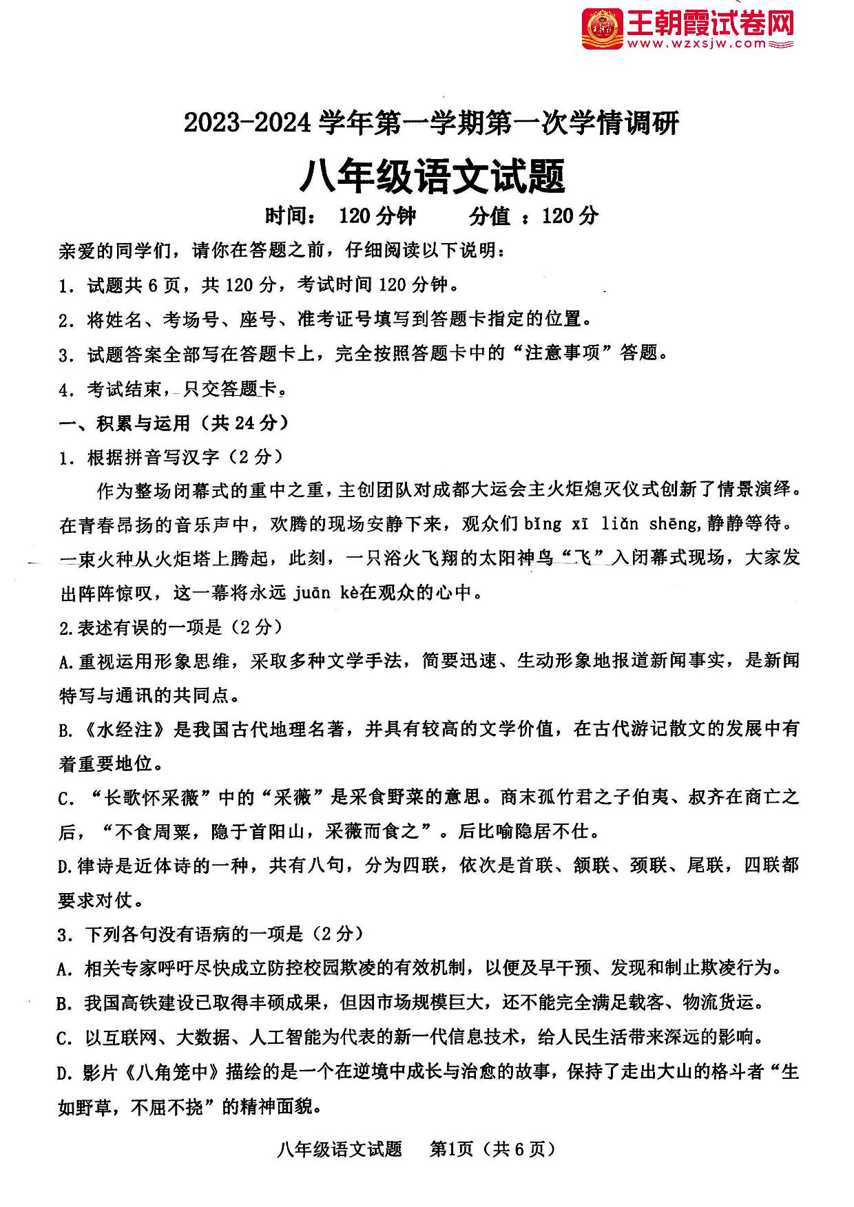 山东省聊城市运河联盟联考2023-2024学年第一学期第一次学情调研(月考)八年级语文(人教版)