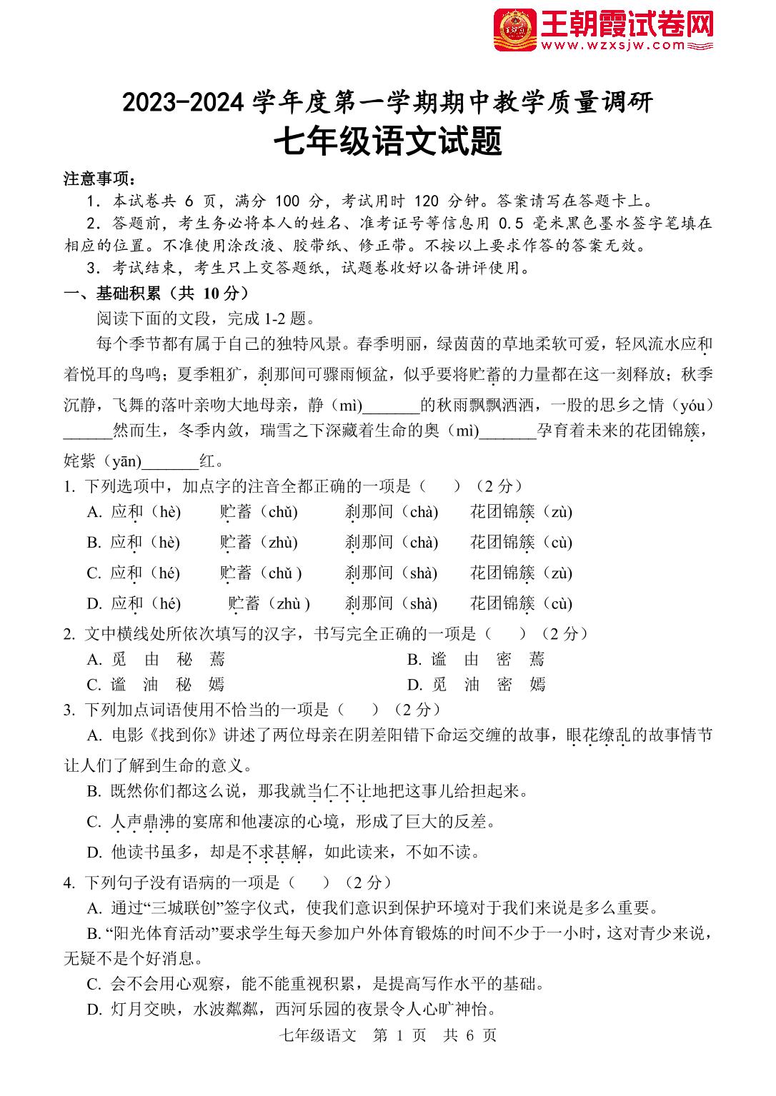 山东省济宁市鱼台县2023-2024学年度第一学期期中教学质量调研七年级语文(人教版)