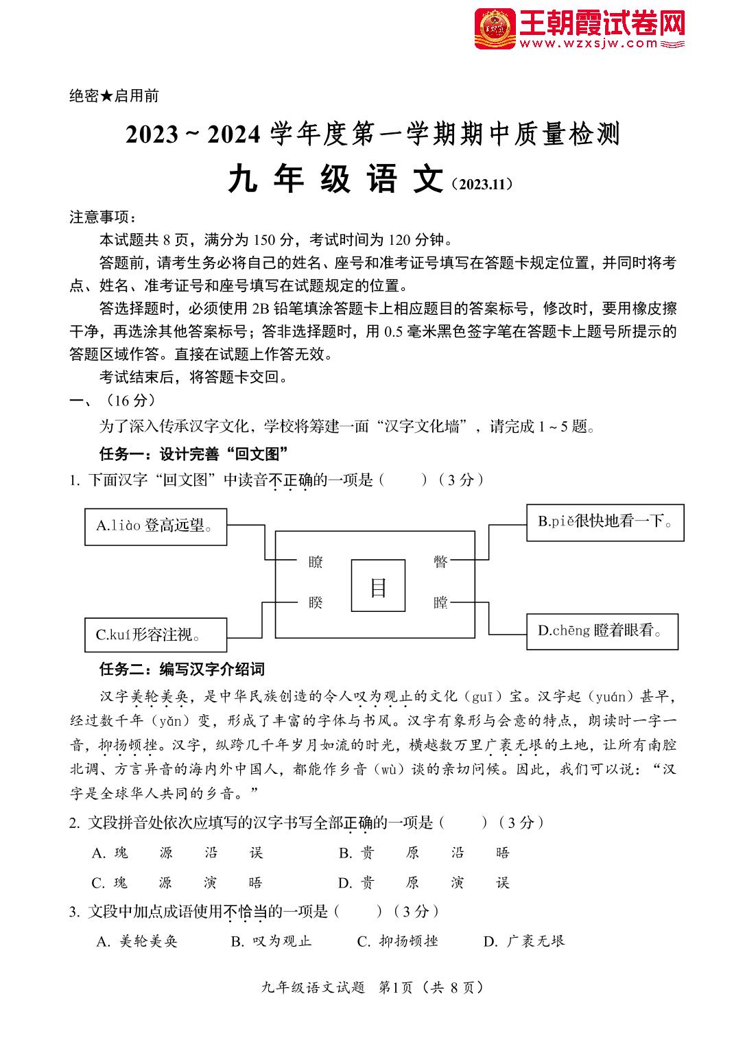 山东省济南市槐荫区2023-2024学年度第一学期期中质量检测九年级语文(人教版)