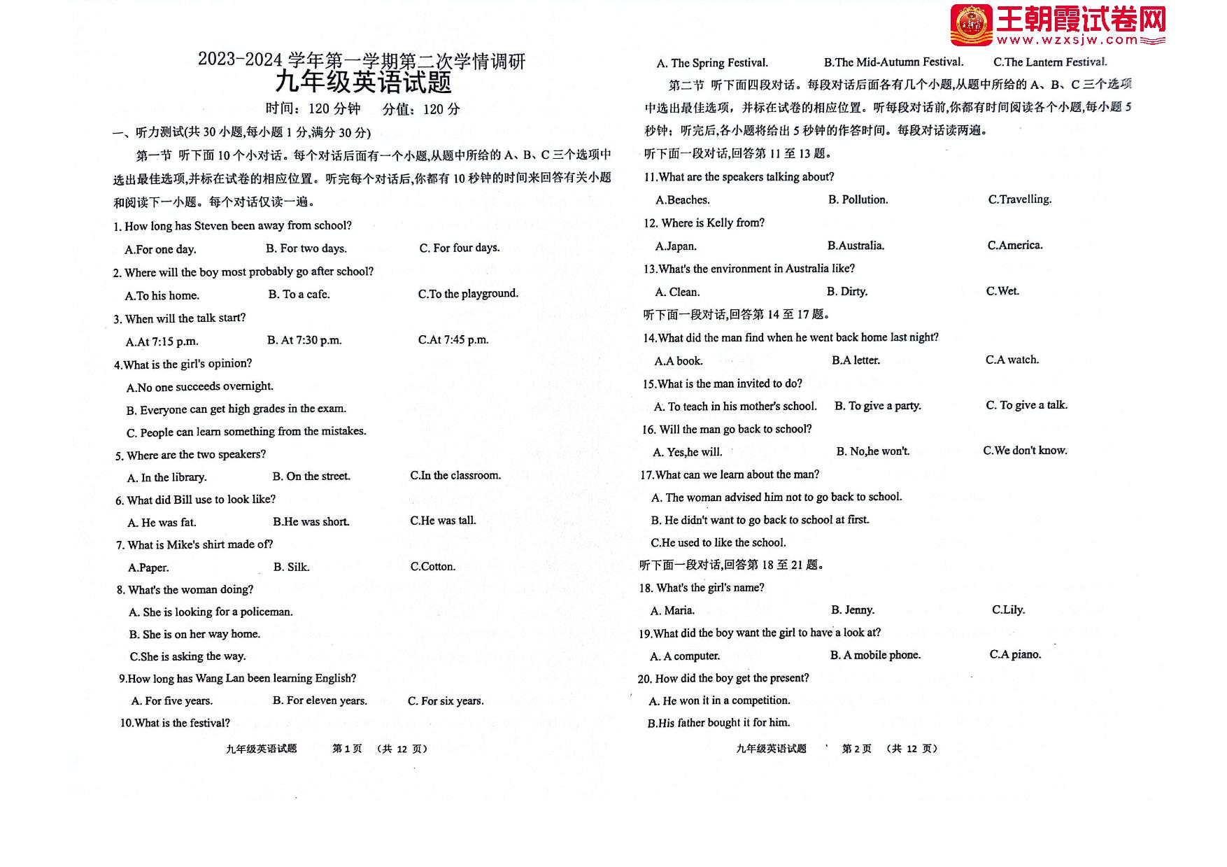 山东省聊城市联盟校2023-2024学年第一学期第二次学情调研(月考)九年级英语(外研版)【无听力音频】