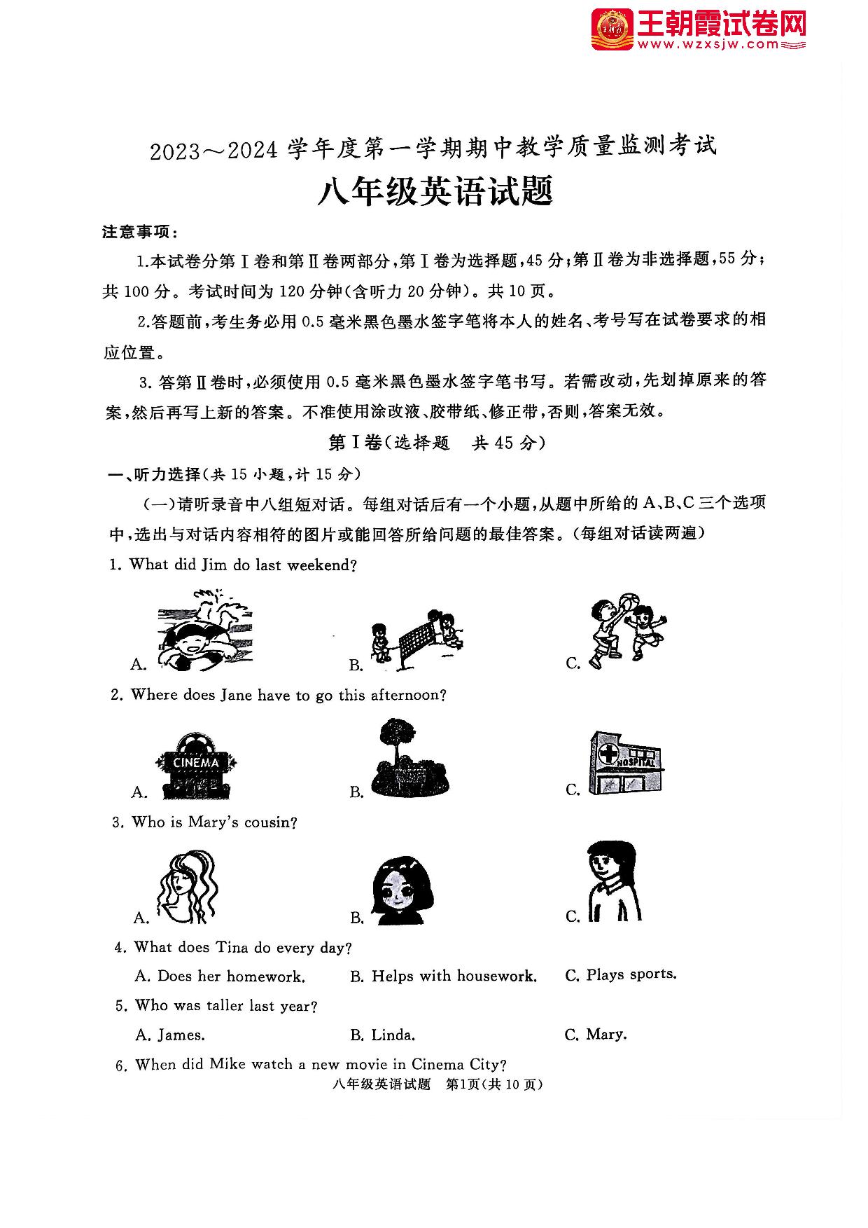 山东省济宁市曲阜市2023-2024学年度第一学期期中教学质量监测考试八年级英语(人教版)【无听力音频】