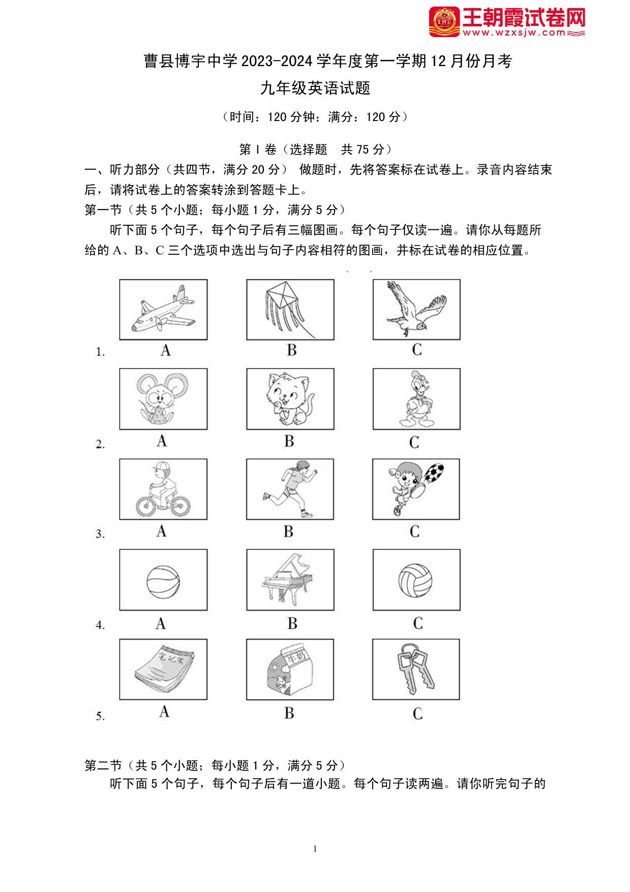 山东省菏泽市曹县博宇中学2023-2024学年度第一学期12月份月考试卷九年级英语(人教版)