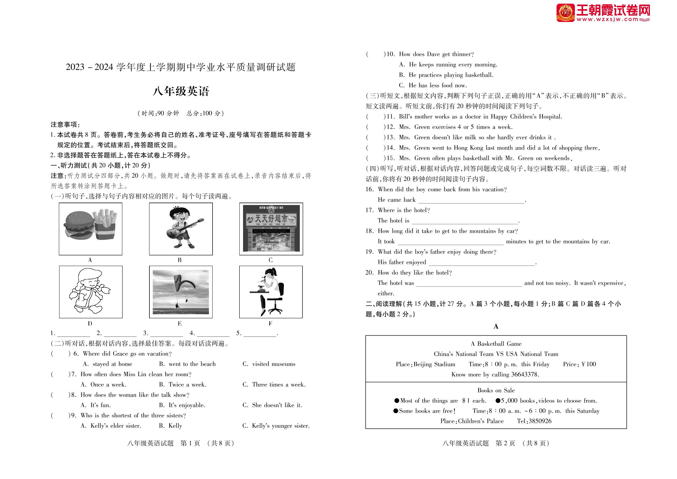 山东省临沂市河东区2023-2024学年度上学期期中学业水平质量调研试题八年级英语(人教版)【无听力音频】