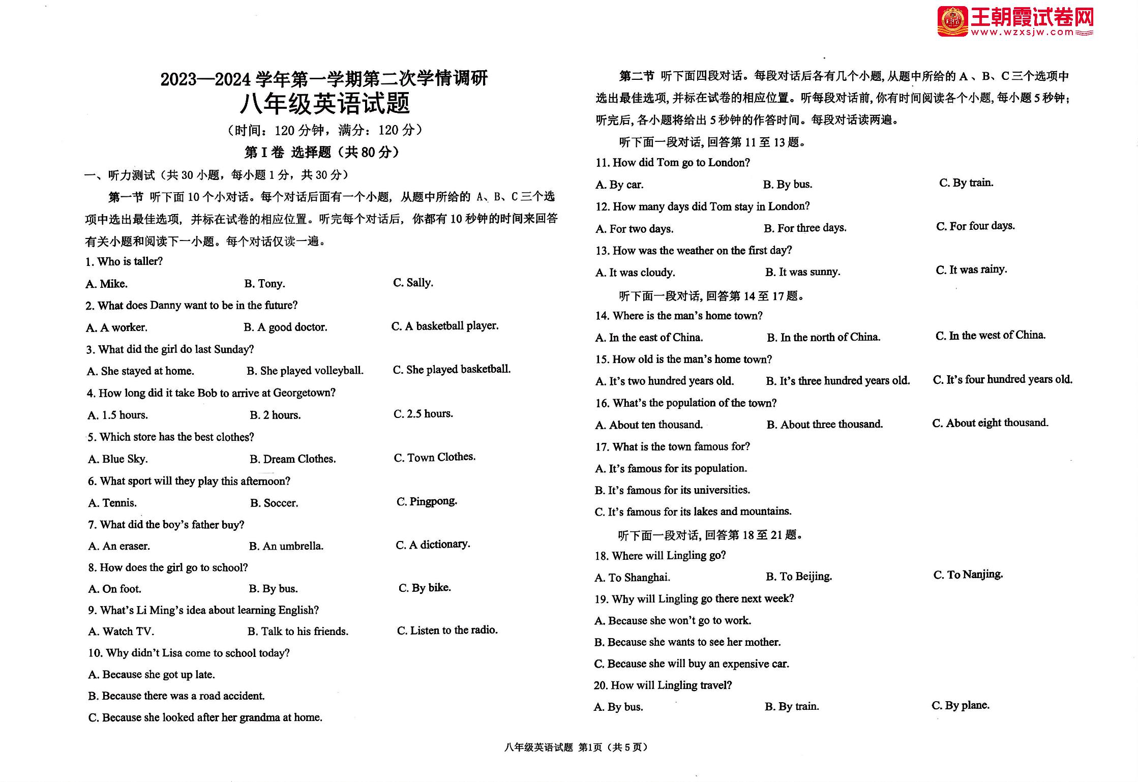 山东省聊城市运河联盟联考2023-2024学年第一学期第二次学情调研(月考)八年级英语(外研版)