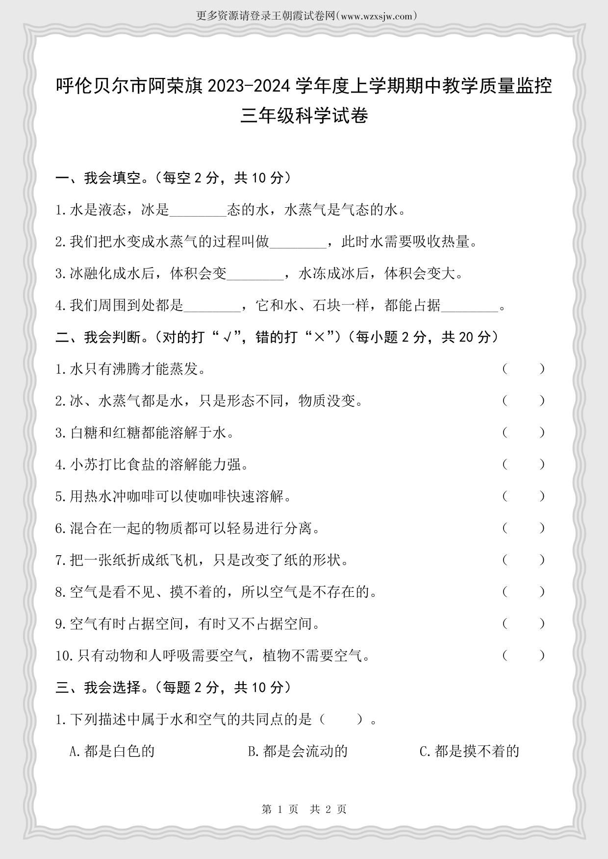 内蒙古自治区呼伦贝尔市阿荣旗2023-2024学年度上学期期中教学质量监控试卷三年级科学(教科版)