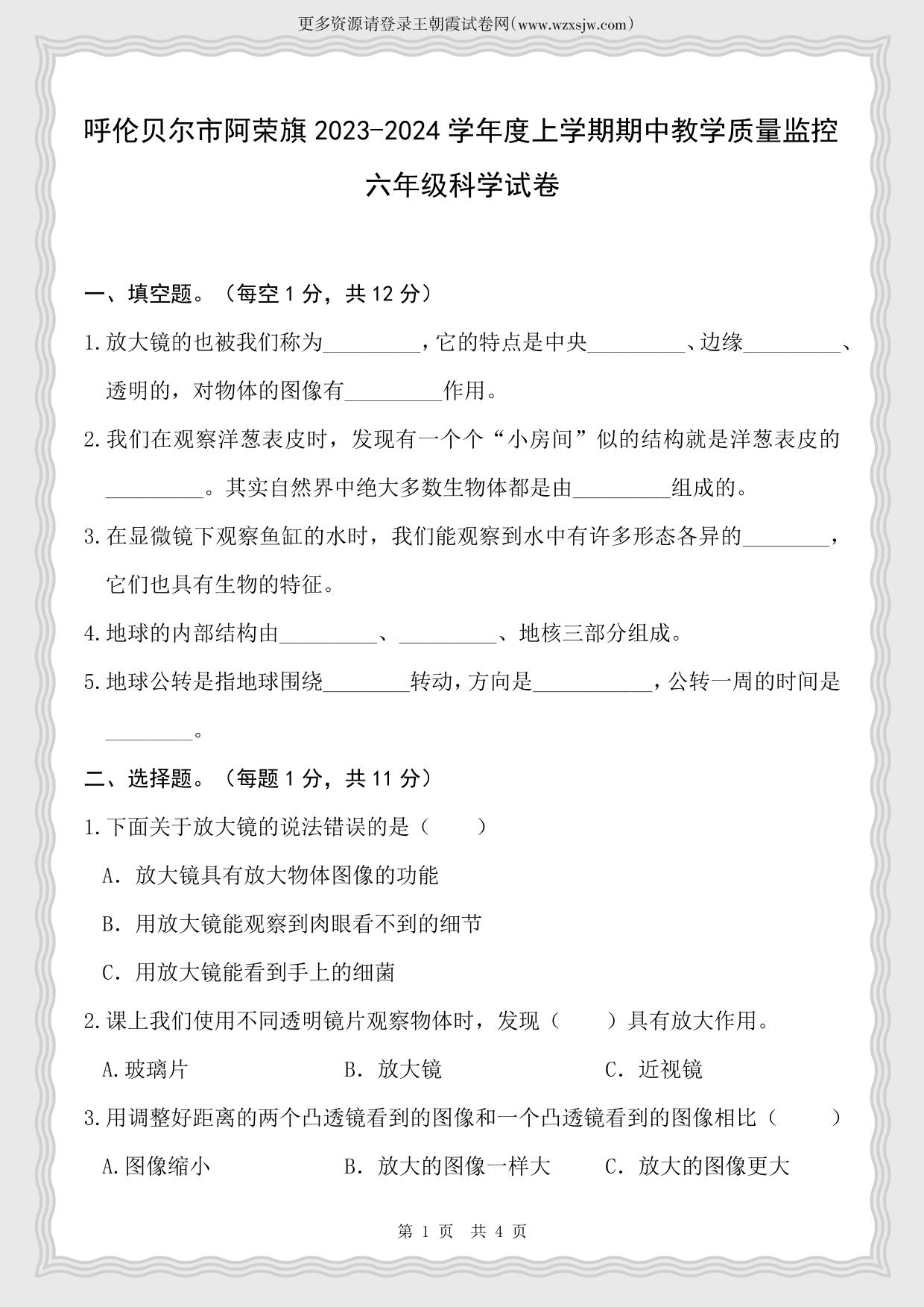 内蒙古自治区呼伦贝尔市阿荣旗2023-2024学年度上学期期中教学质量监控试卷六年级科学(教科版)