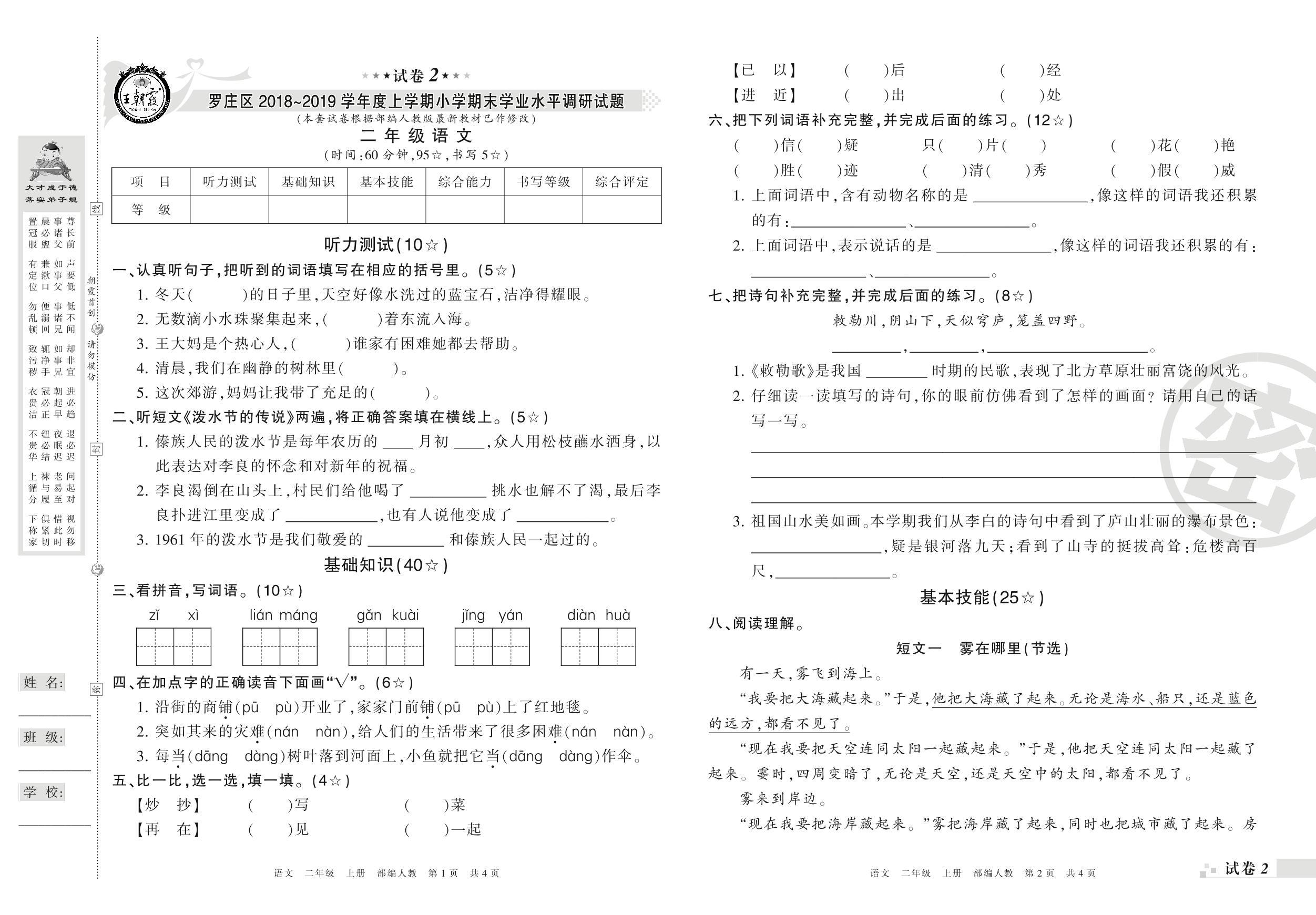 2018-2019学年第一学期临沂市罗庄区二年级语文试卷(人教版)【2】