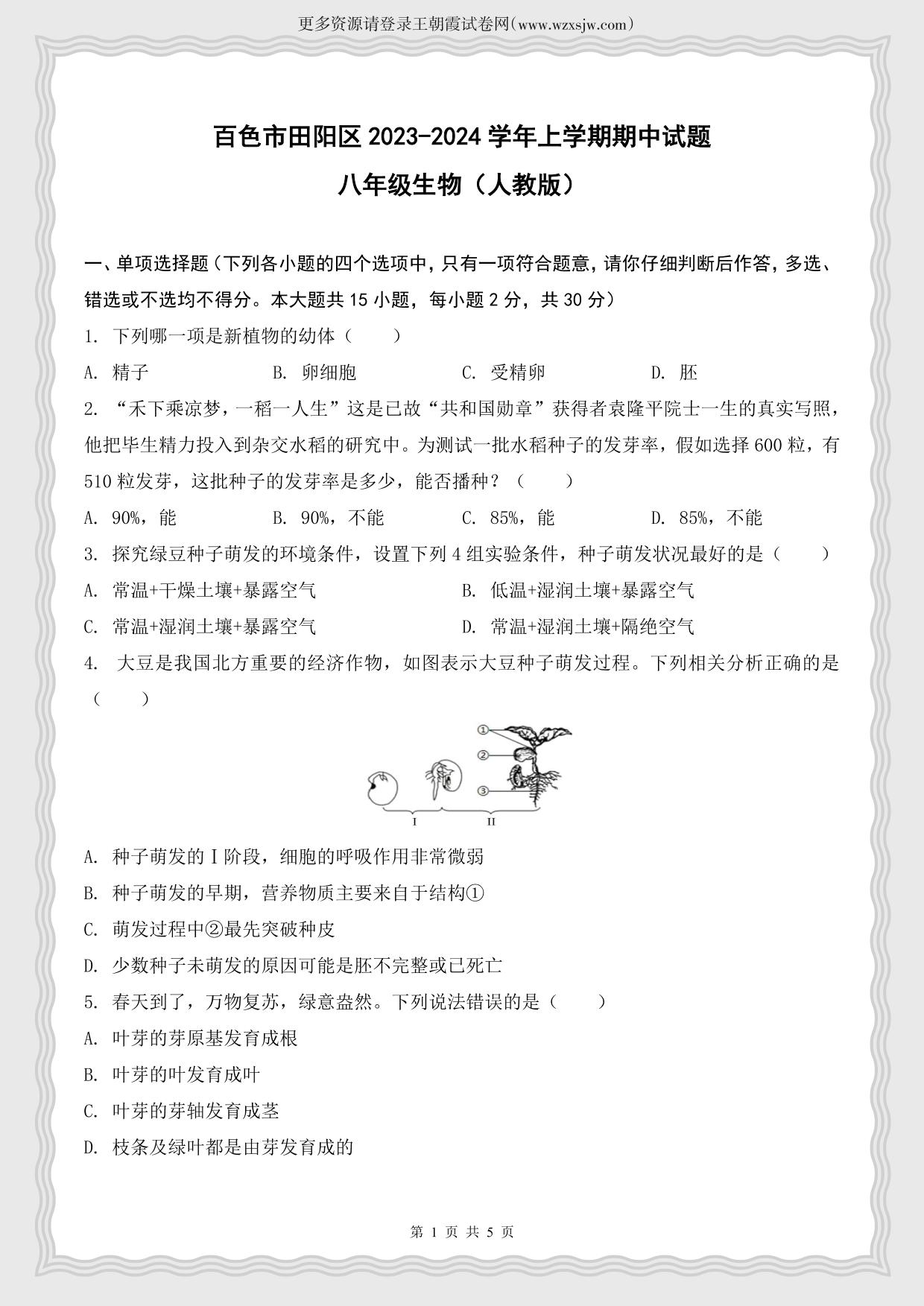 广西百色市田阳区2023-2024学年上学期期中试题八年级生物(人教版)