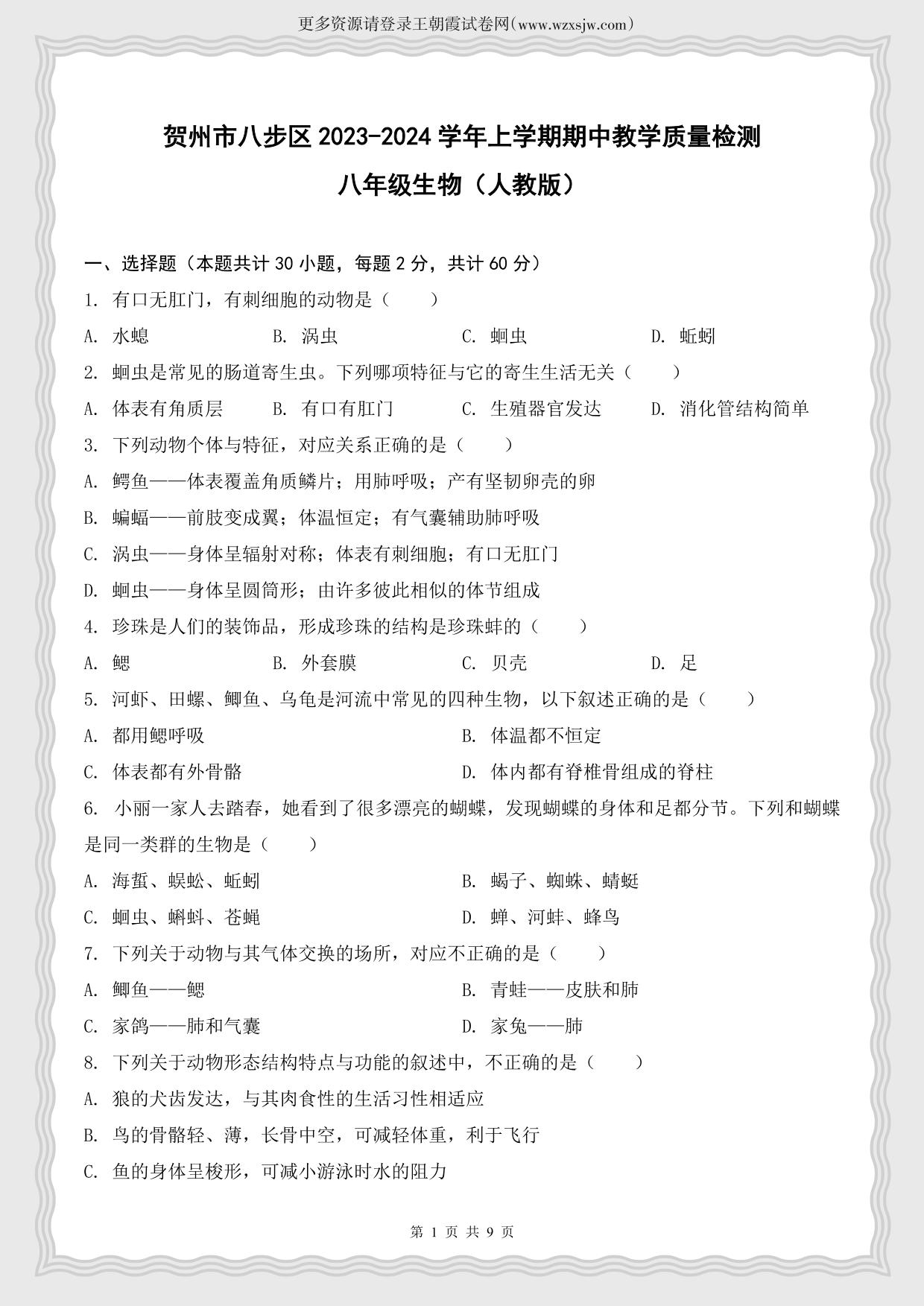 广西贺州市八步区2023-2024学年上学期期中教学质量检测八年级生物(人教版)