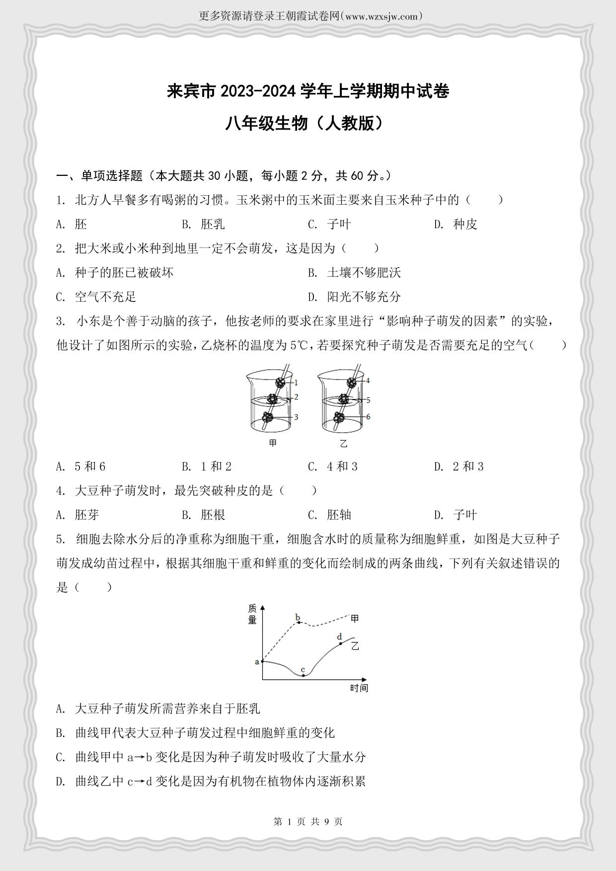 广西来宾市2023-2024学年上学期期中试卷八年级生物(人教版)