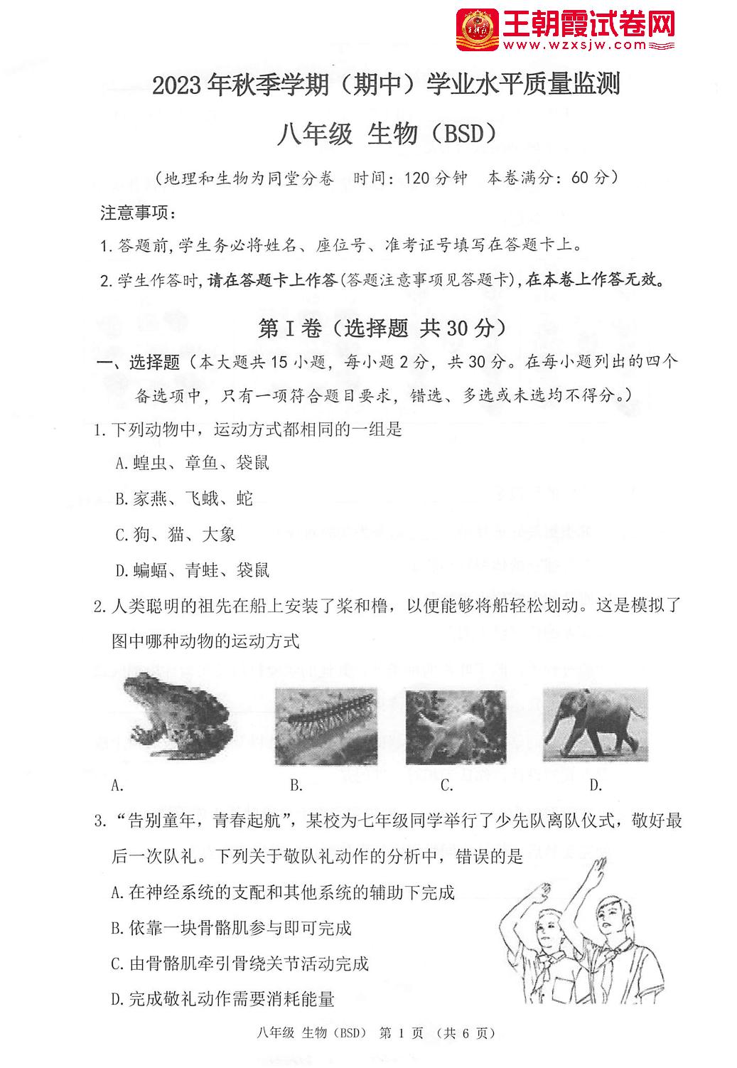 广西河池市凤山县2023-2024学年上学期期中学业水平质量监测八年级生物(北师版)