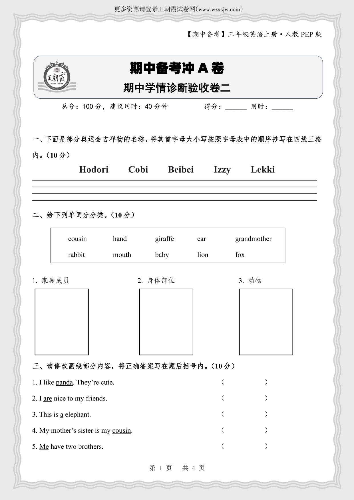 【期中备考】三年级英语上册人教PEP版·期中学情诊断验收卷二