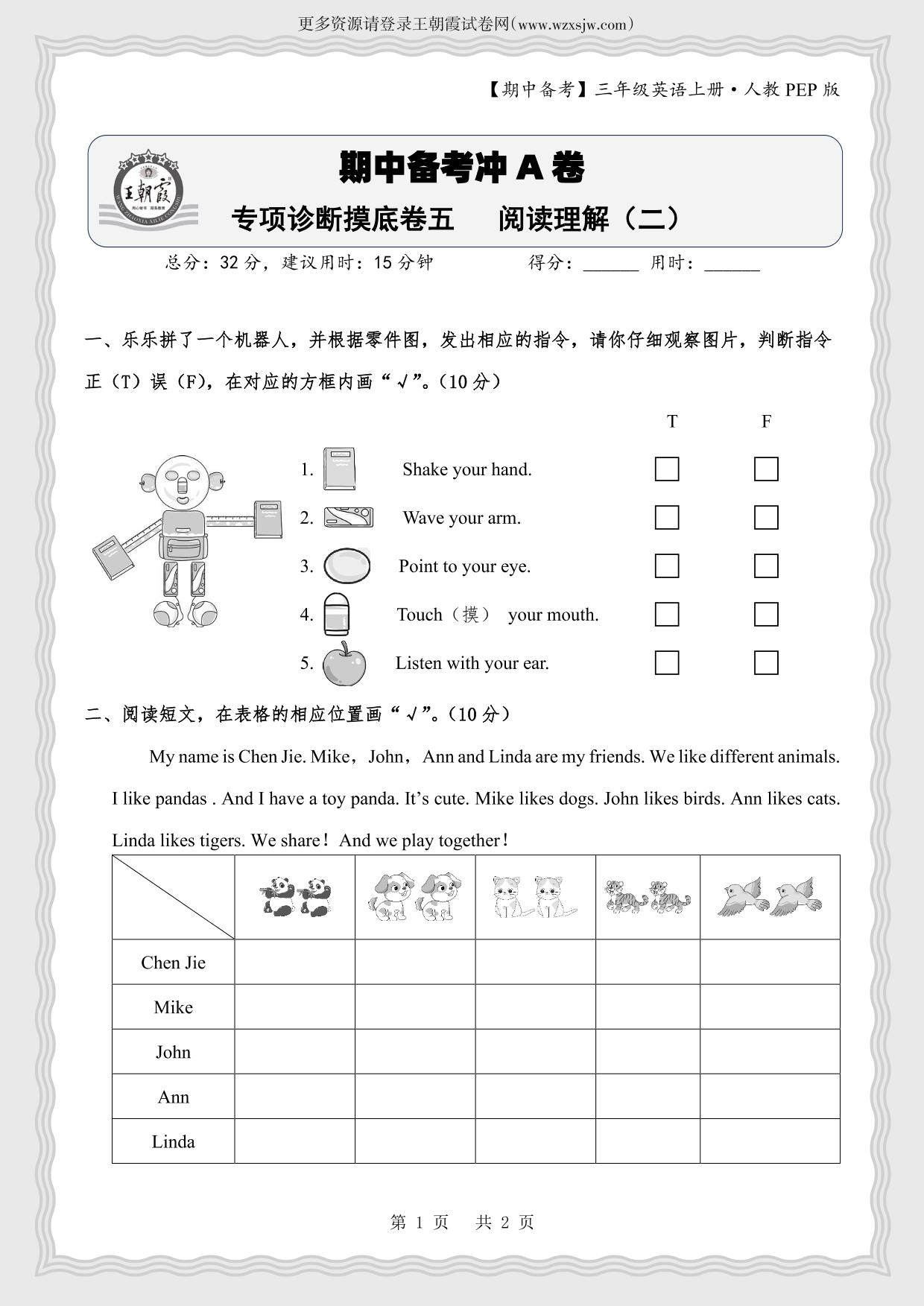 【期中备考】三年级英语上册人教PEP版·专项诊断摸底卷五 阅读理解(二)