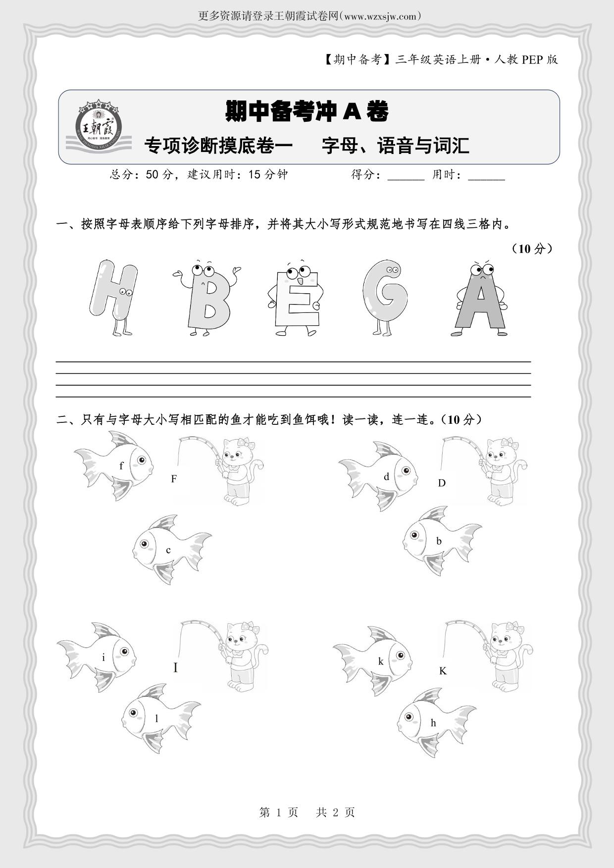 【期中备考】三年级英语上册人教PEP版·专项诊断摸底卷一 字母、语音与词汇