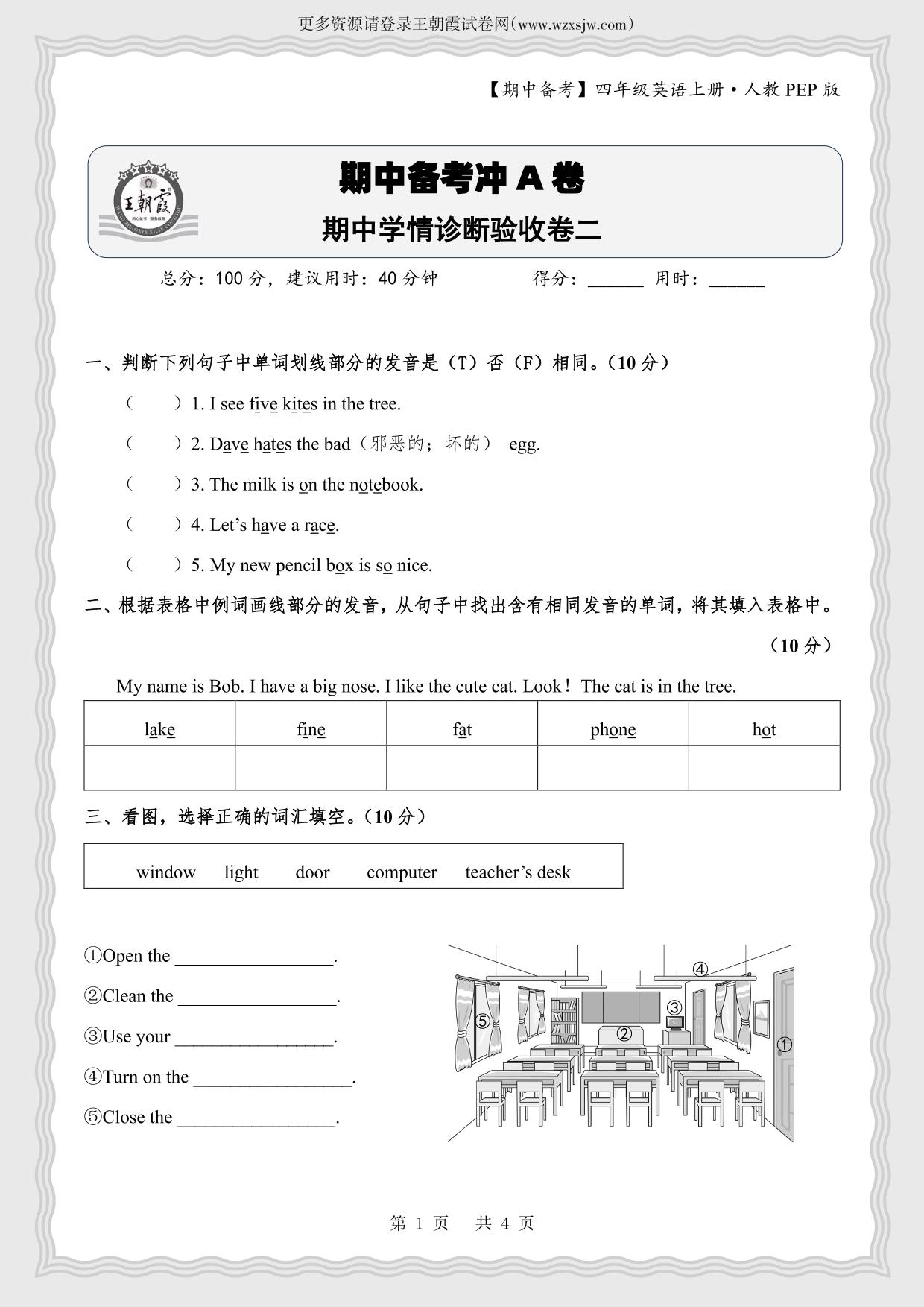 【期中备考】四年级英语上册人教PEP版·期中学情诊断验收卷二