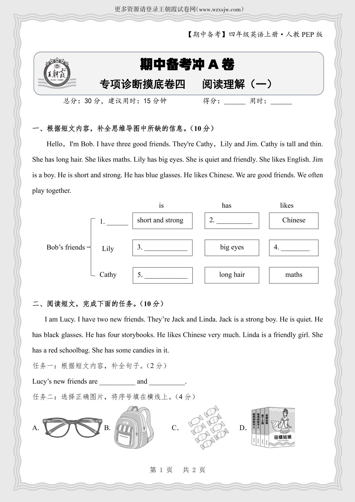 【期中备考】四年级英语上册人教PEP版·专项诊断摸底卷四 阅读理解(一)