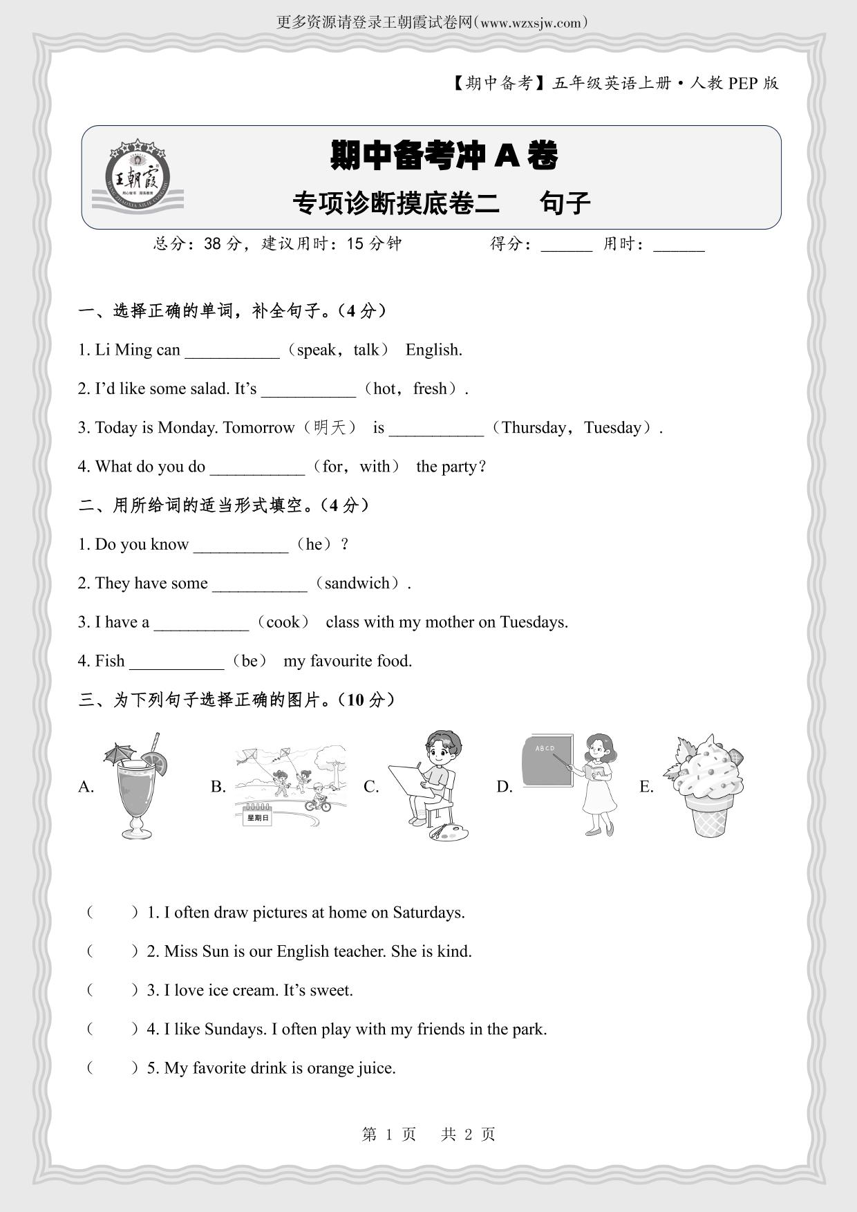 【期中备考】五年级英语上册人教PEP版·专项诊断摸底卷二 句子