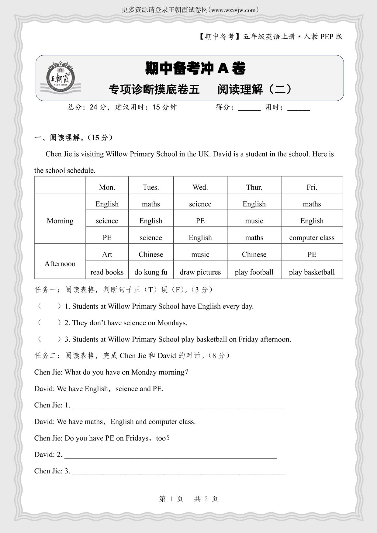 【期中备考】五年级英语上册人教PEP版·专项诊断摸底卷五 阅读理解(二)