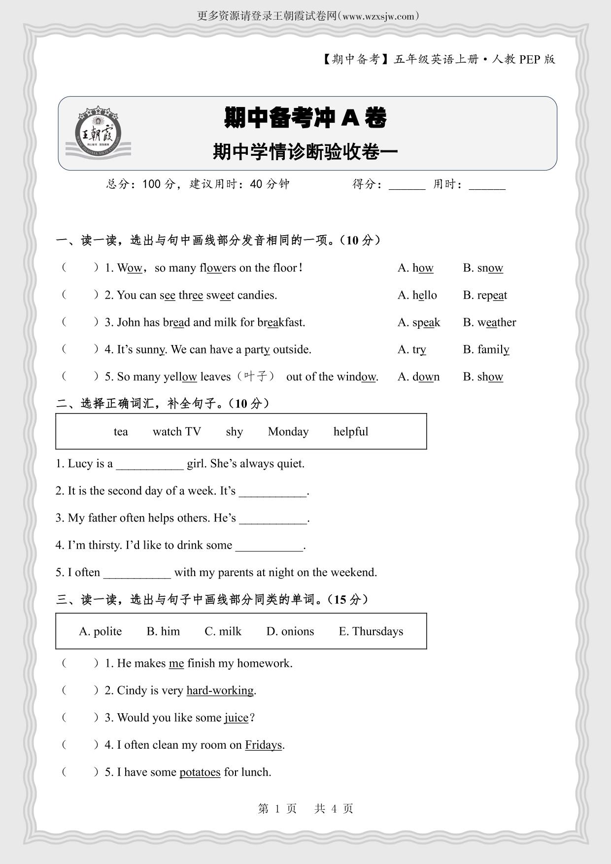 【期中备考】五年级英语上册人教PEP版·期中学情诊断验收卷一