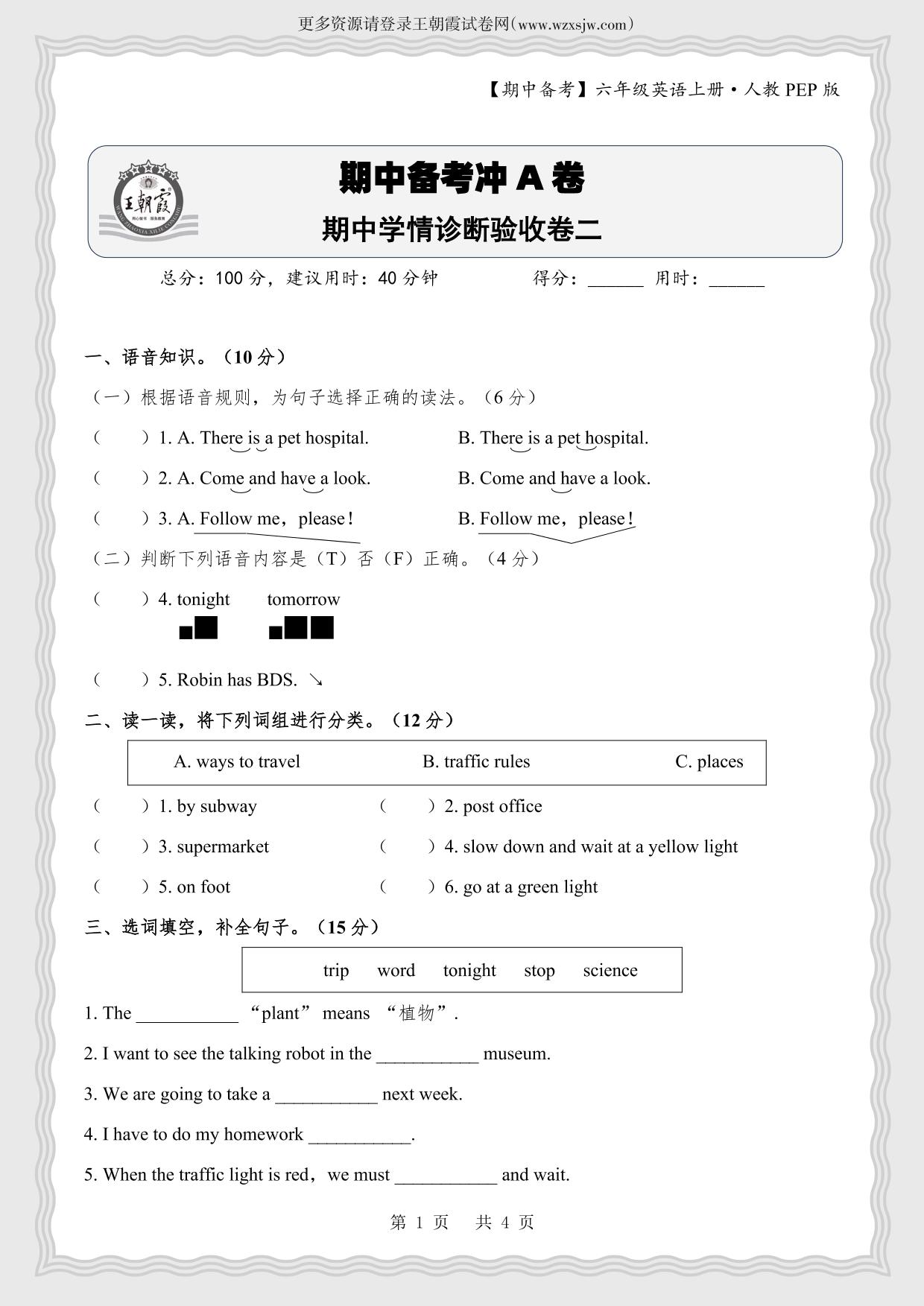 【期中备考】六年级英语上册人教PEP版·期中学情诊断验收卷二