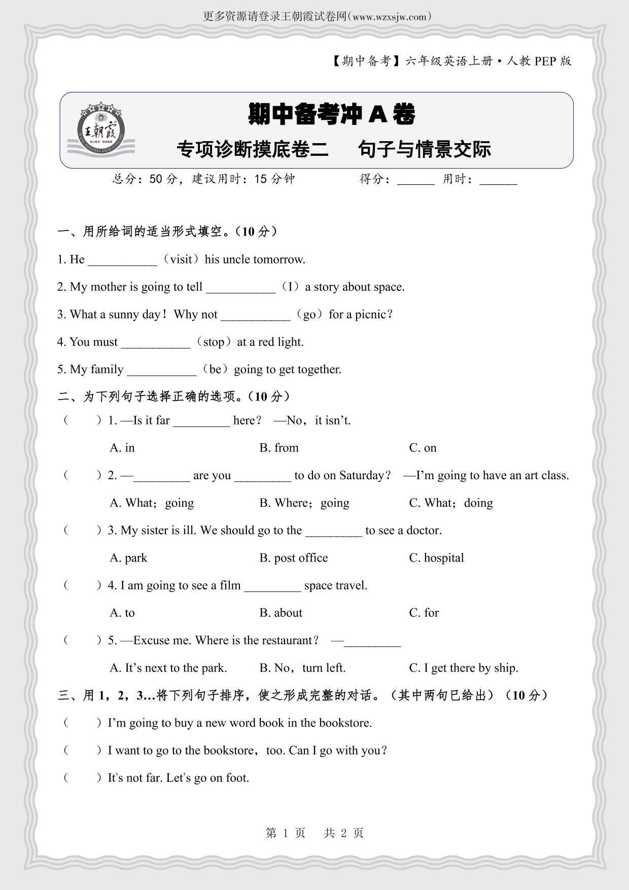 【期中备考】六年级英语上册人教PEP版·专项诊断摸底卷二 句子与情景交际
