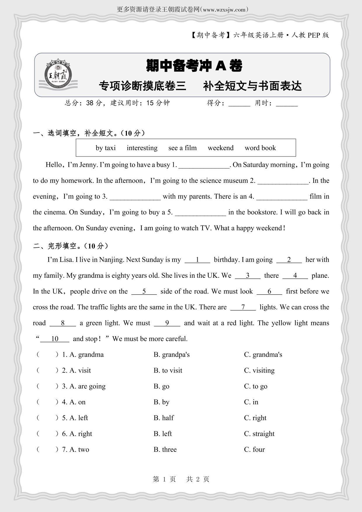 【期中备考】六年级英语上册人教PEP版·专项诊断摸底卷三 补全短文与书面表达