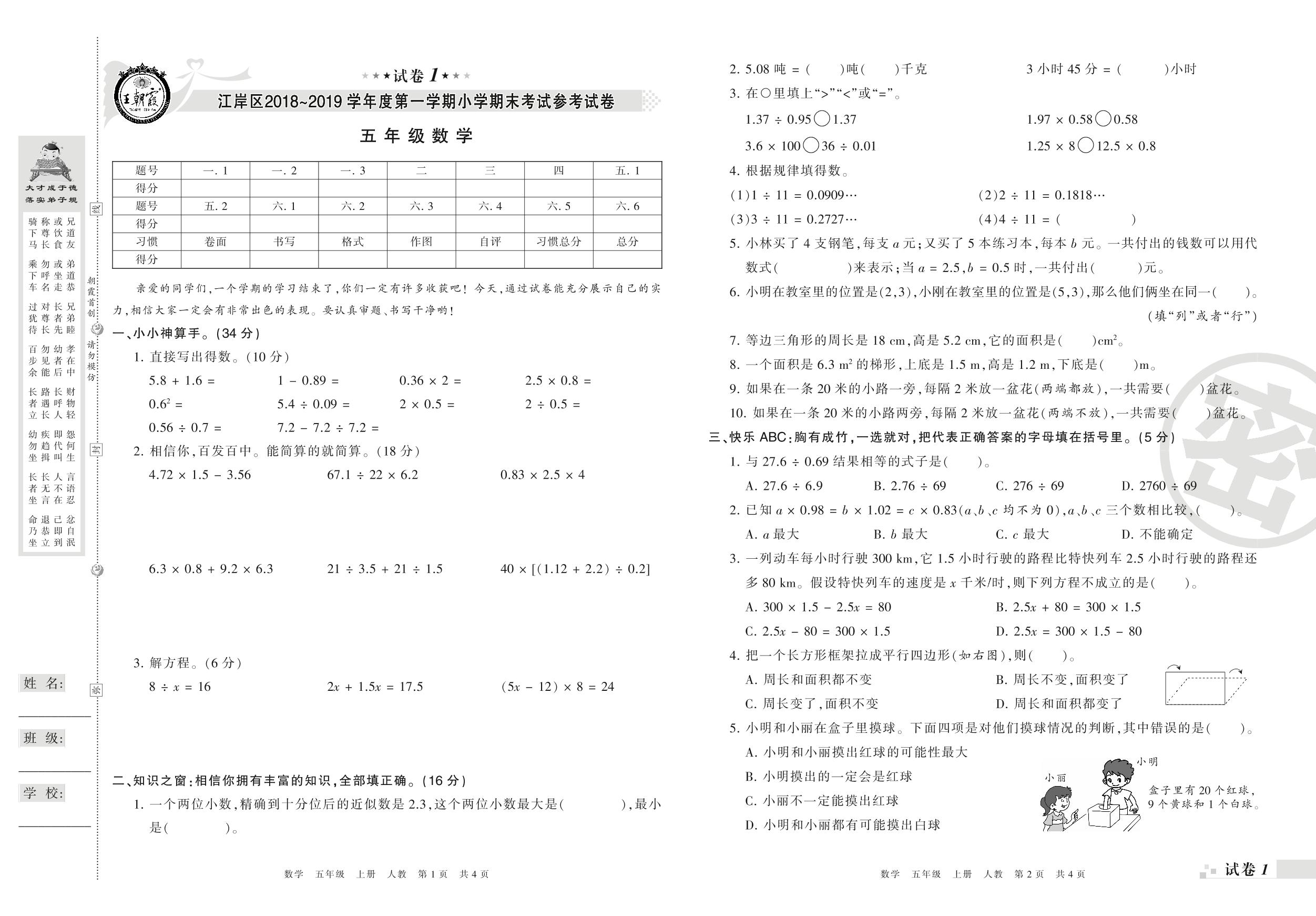 2018-2019学年第一学期武汉市江岸区五年级数学试卷(人教版)【1】