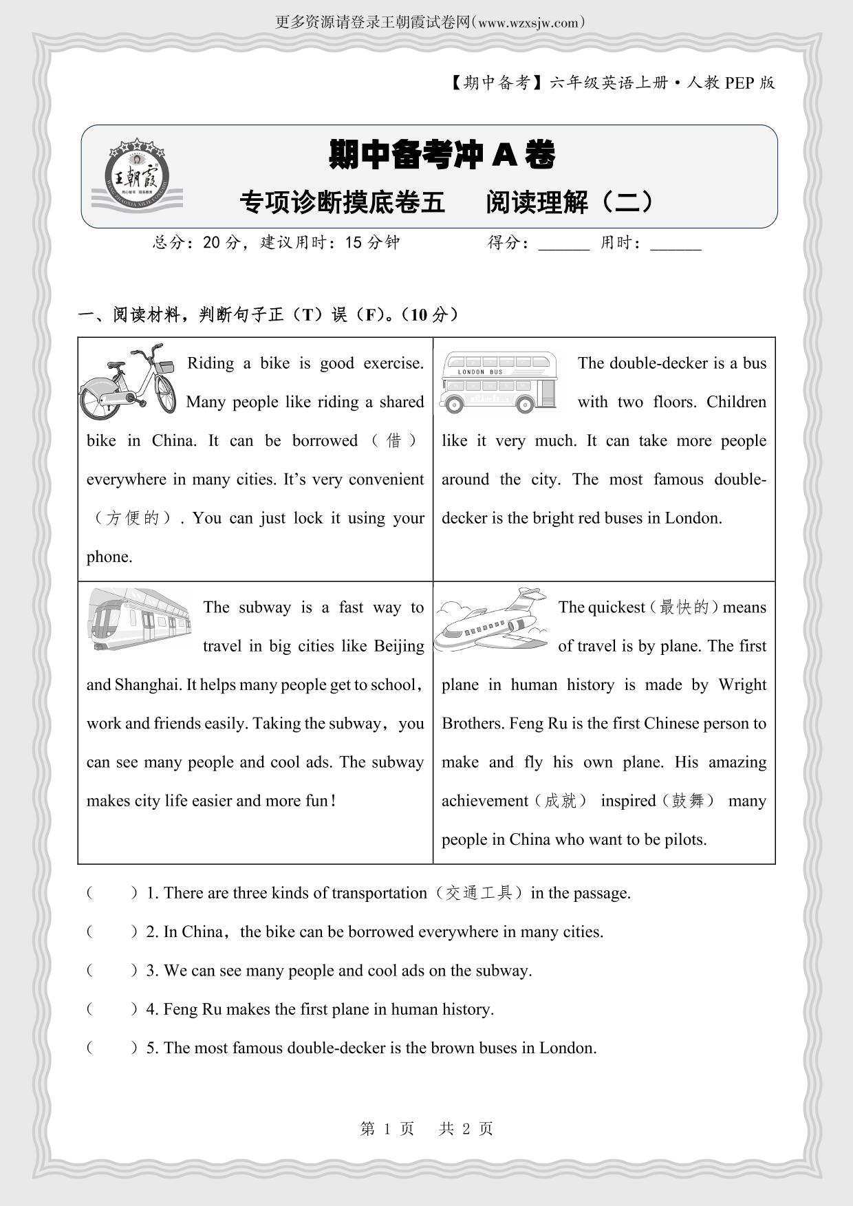 【期中备考】六年级英语上册人教PEP版·专项诊断摸底卷五 阅读理解(二)