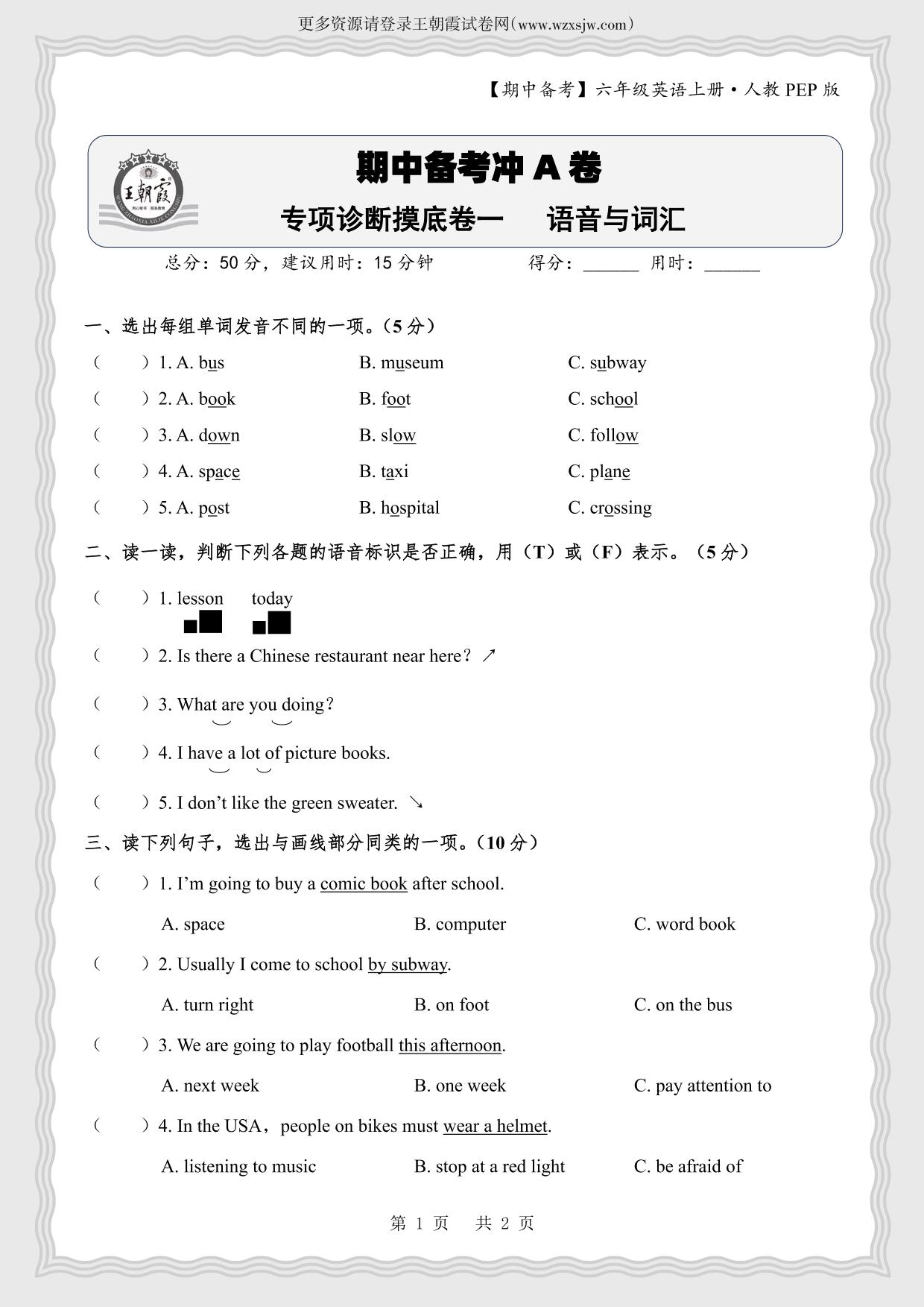 【期中备考】六年级英语上册人教PEP版·专项诊断摸底卷一 语音与词汇