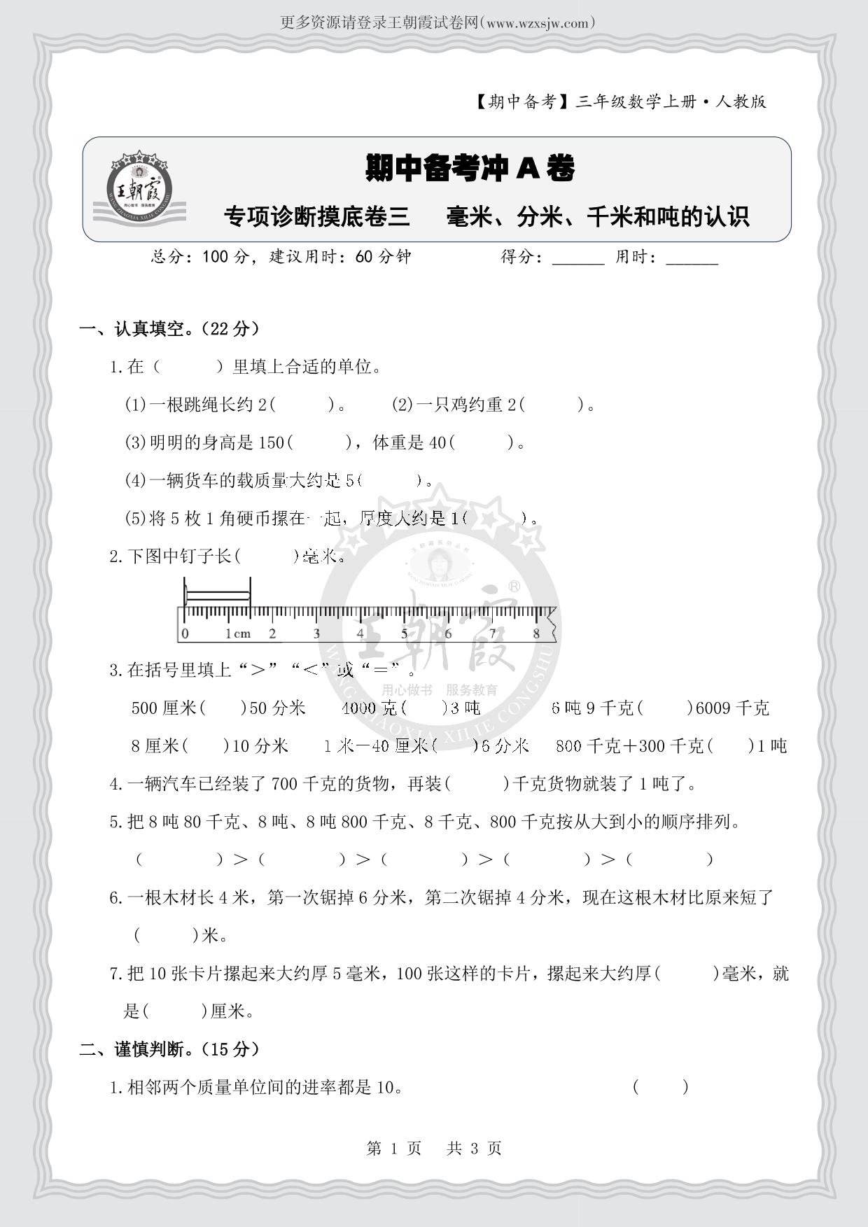 【期中备考】三年级数学上册人教版·专项诊断摸底卷三 毫米、分米、千米和吨的认识