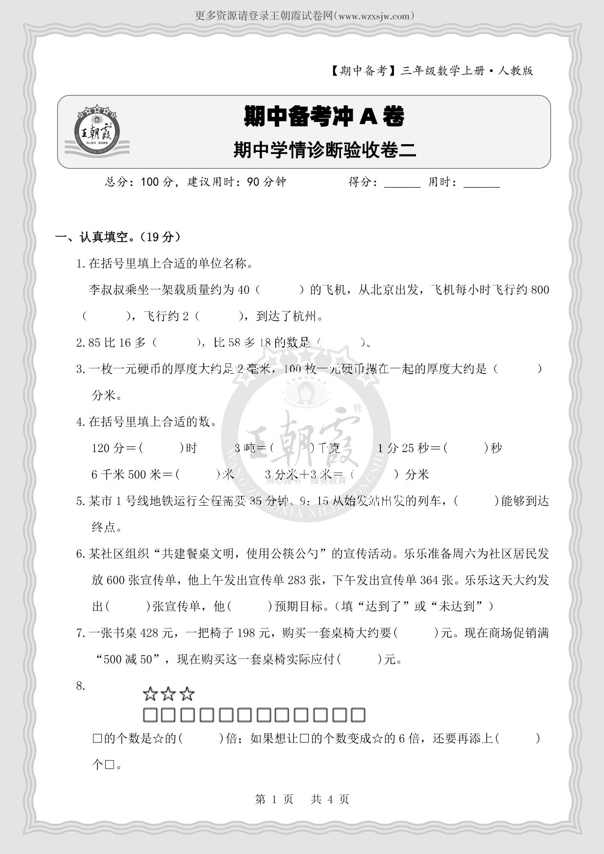 【期中备考】三年级数学上册人教版·期中学情诊断验收卷二