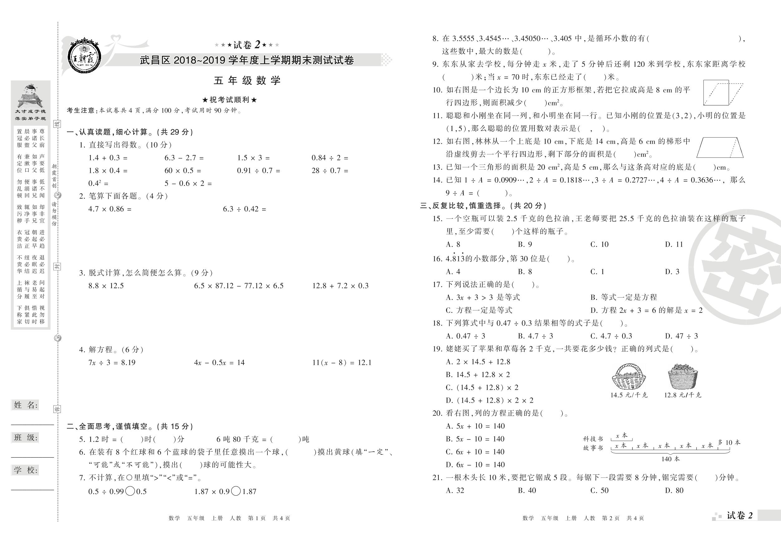 2018-2019学年第一学期武汉市武昌区五年级数学试卷(人教版)【2】