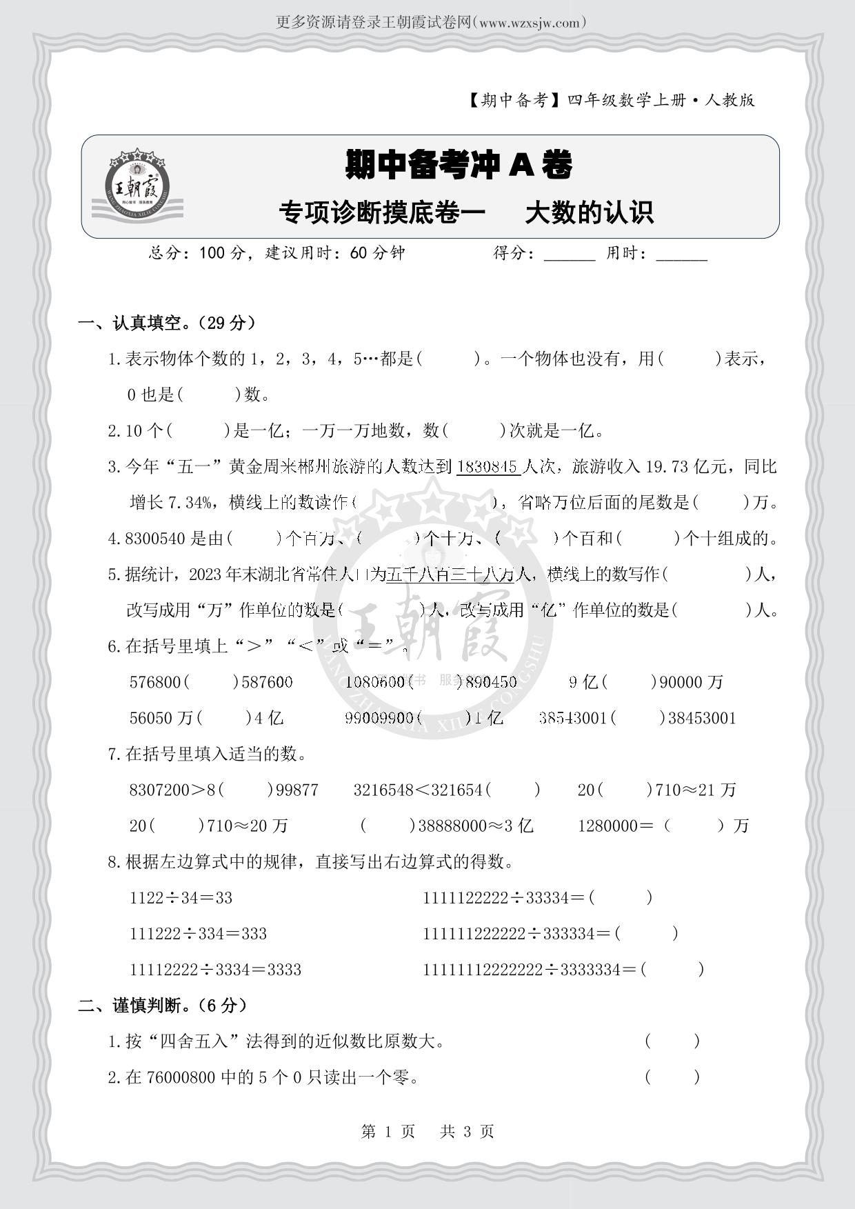 【期中备考】四年级数学上册人教版·专项诊断摸底卷一 大数的认识