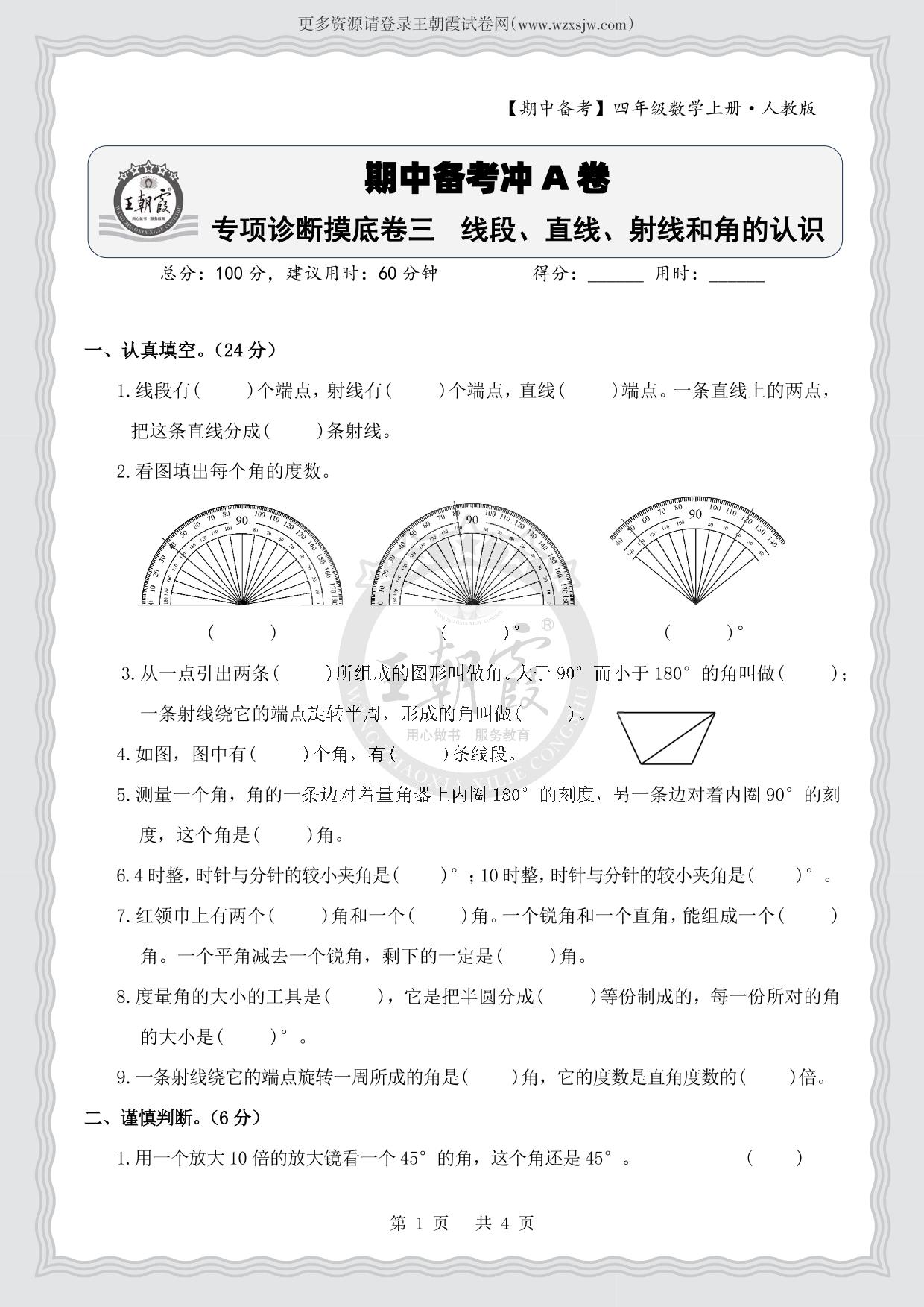 【期中备考】四年级数学上册人教版·专项诊断摸底卷三 线段、直线、射线和角的认识