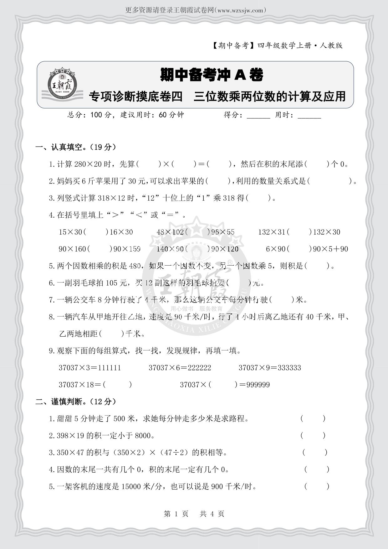 【期中备考】四年级数学上册人教版·专项诊断摸底卷四 三位数乘两位数的计算及应用