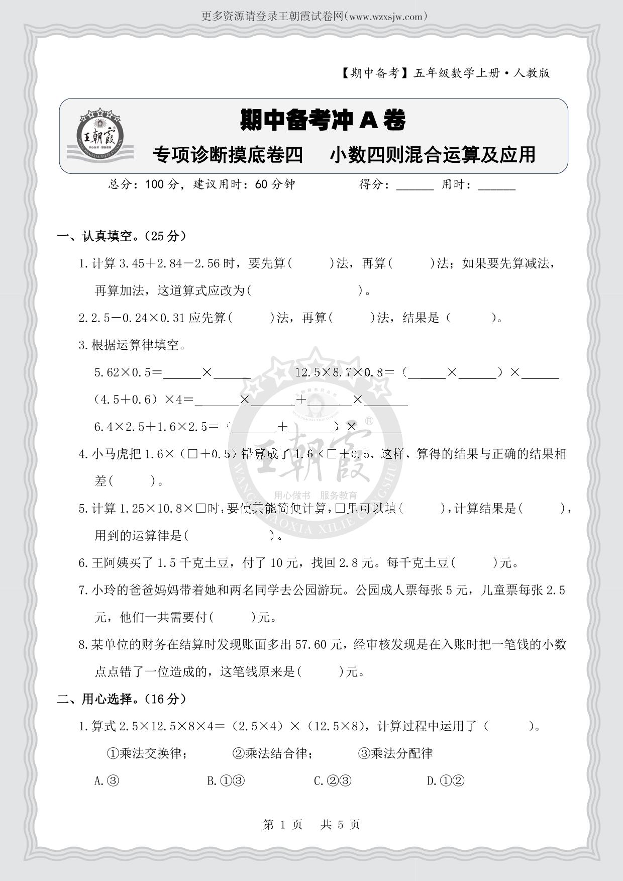 【期中备考】五年级数学上册人教版·专项诊断摸底卷四 小数四则混合运算及应用