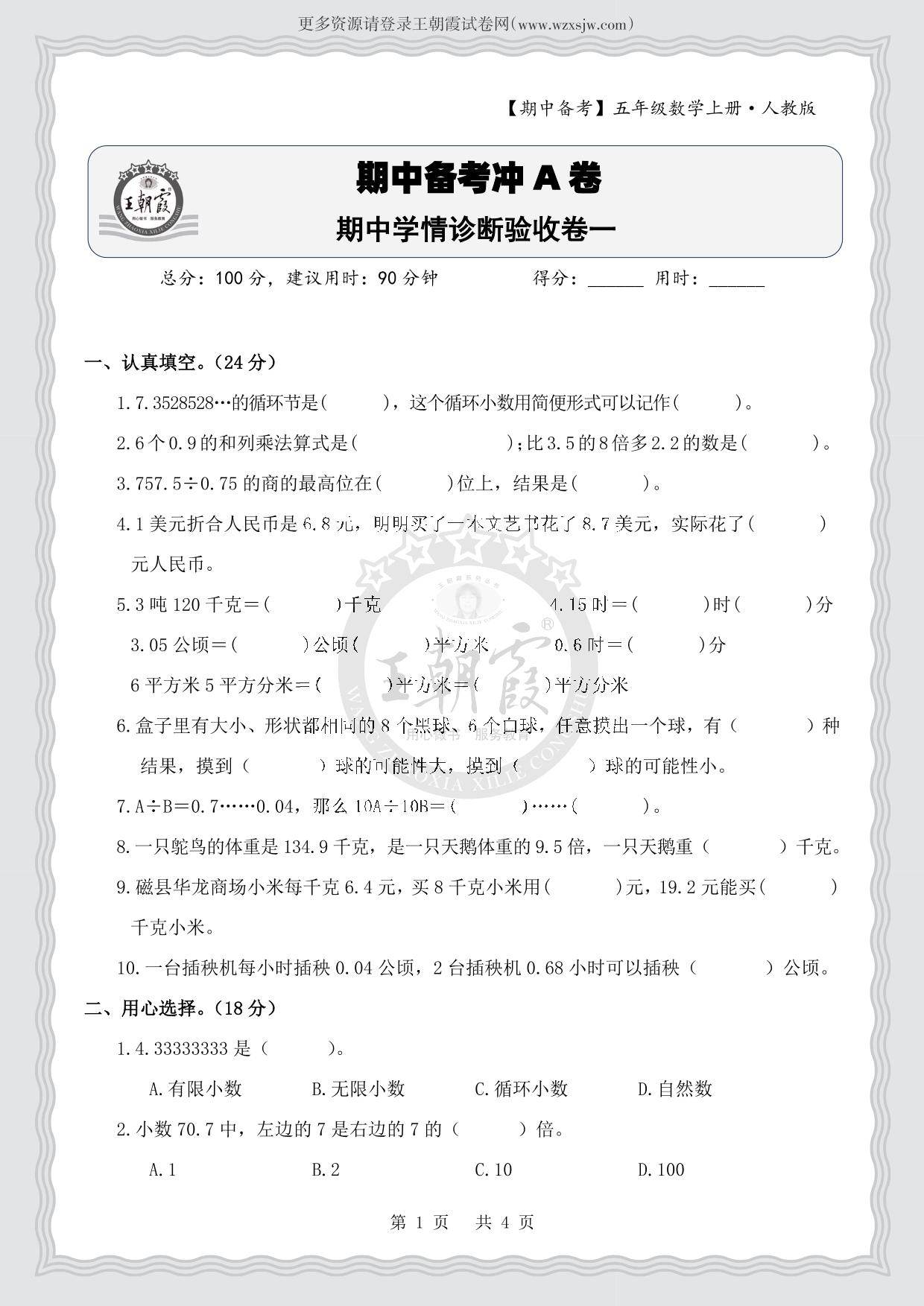 【期中备考】五年级数学上册人教版·期中学情诊断验收卷一