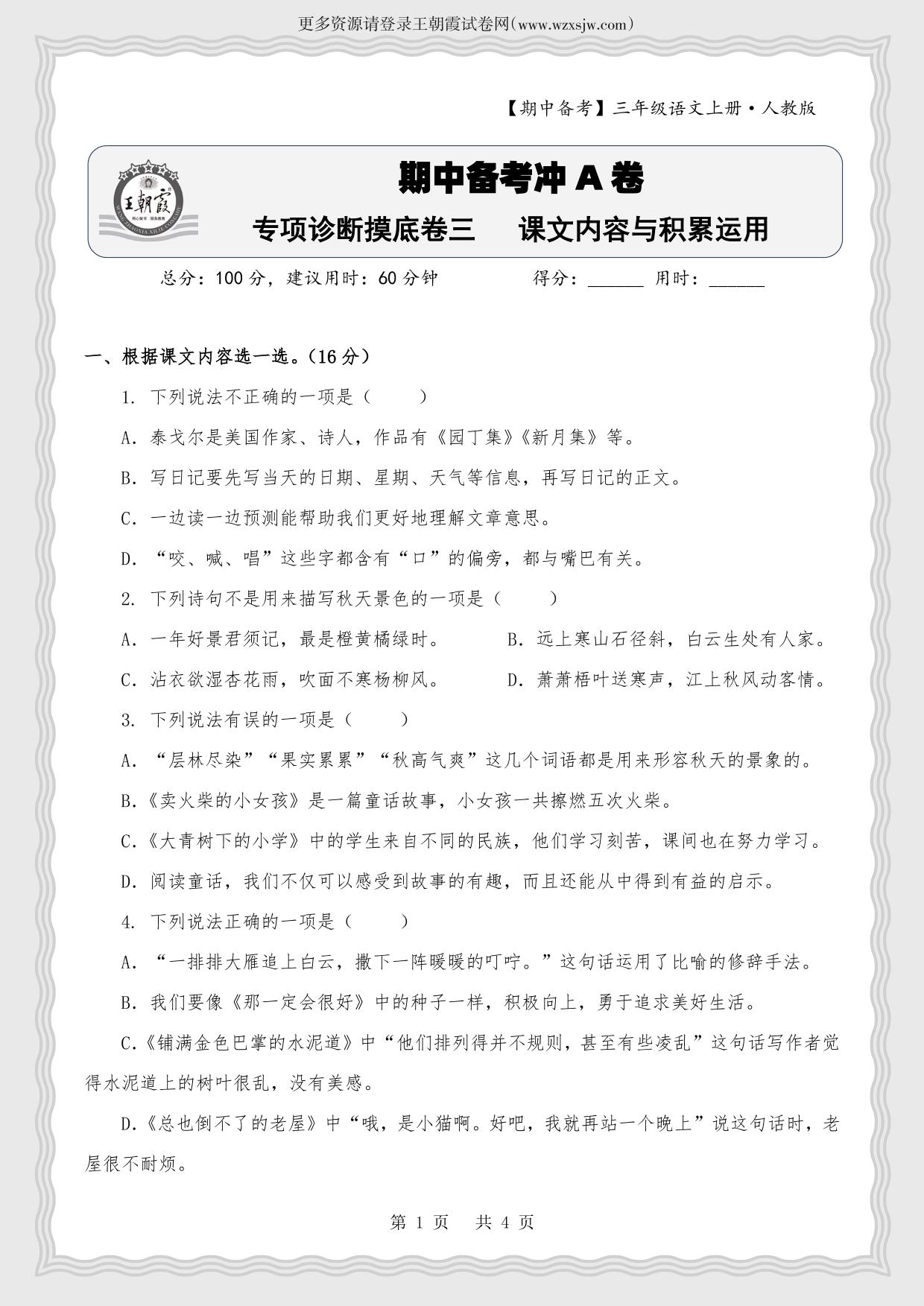 【期中备考】三年级语文上册人教版·专项诊断摸底卷三 课文内容与积累运用