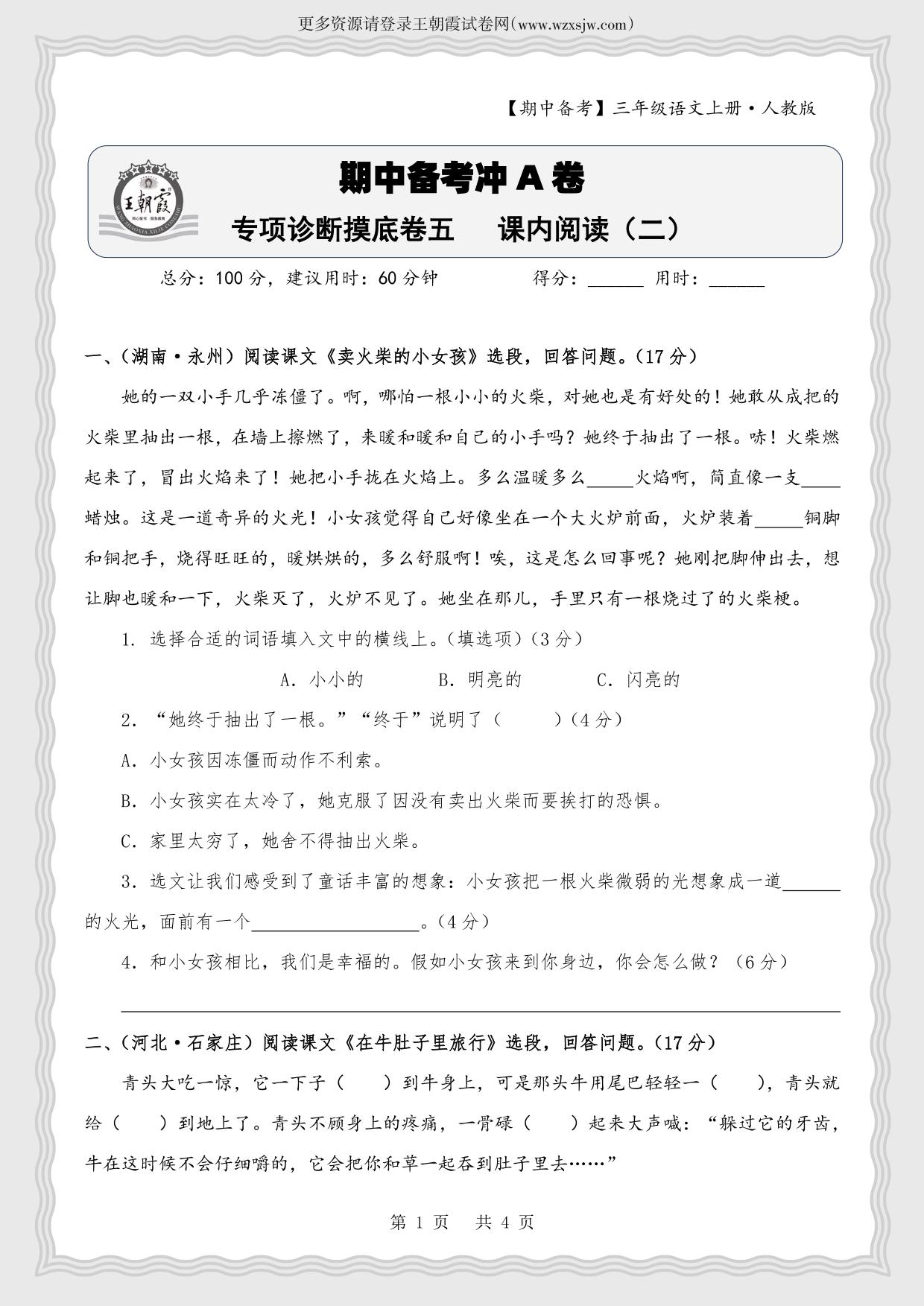 【期中备考】三年级语文上册人教版·专项诊断摸底卷五 课内阅读(二)