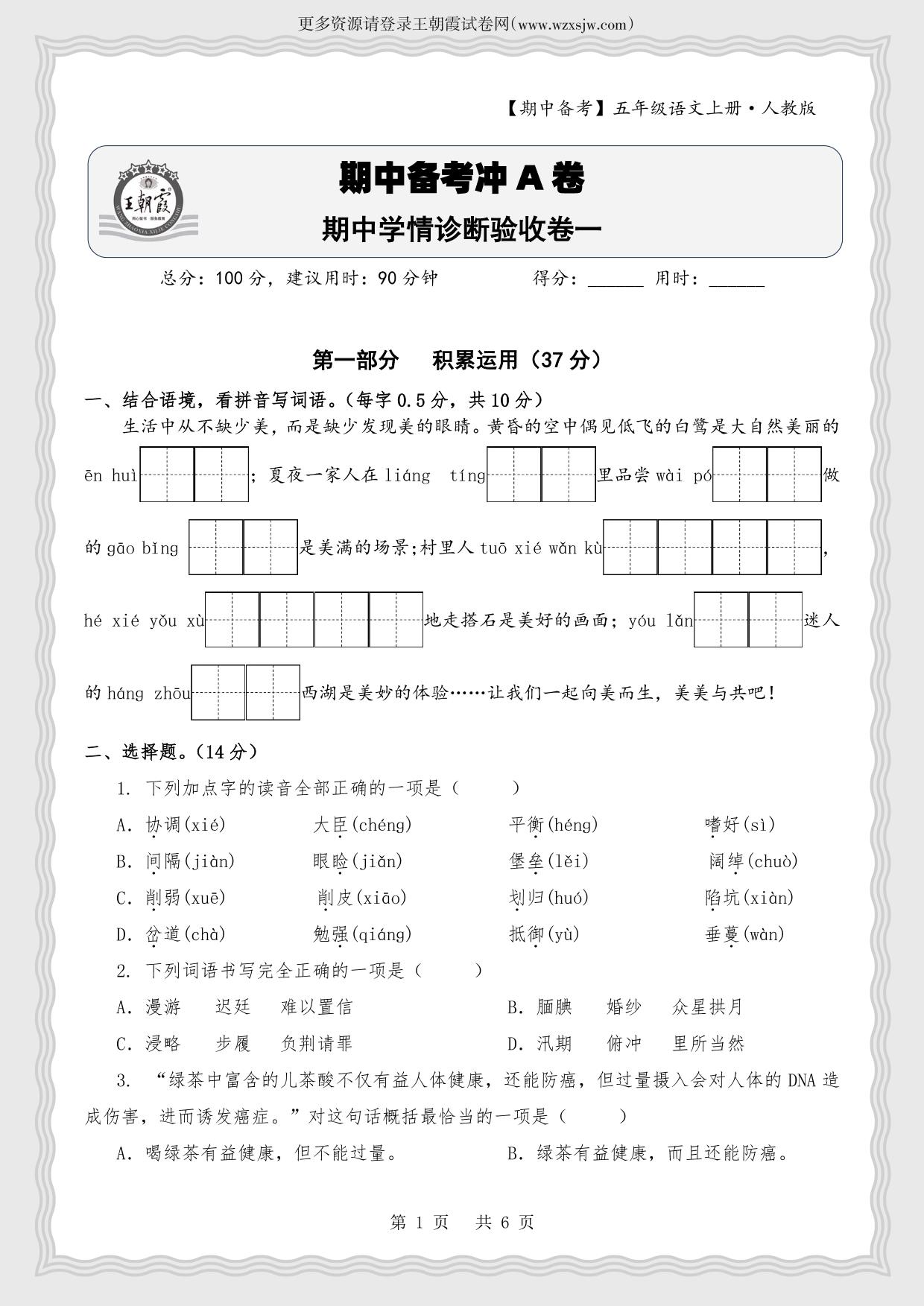 【期中备考】五年级语文上册人教版·期中学情诊断验收卷一
