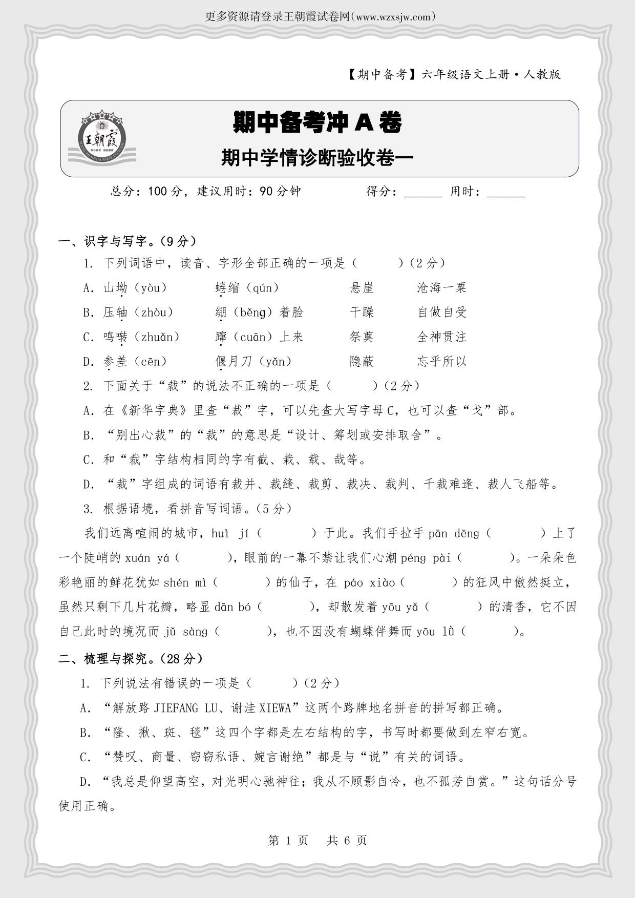 【期中备考】六年级语文上册人教版·期中学情诊断验收卷一