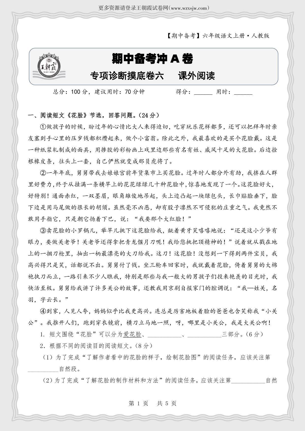 【期中备考】六年级语文上册人教版·专项诊断摸底卷六 课外阅读