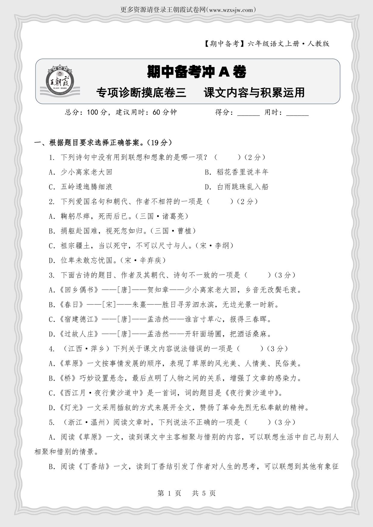 【期中备考】六年级语文上册人教版·专项诊断摸底卷三 课文内容与积累运用