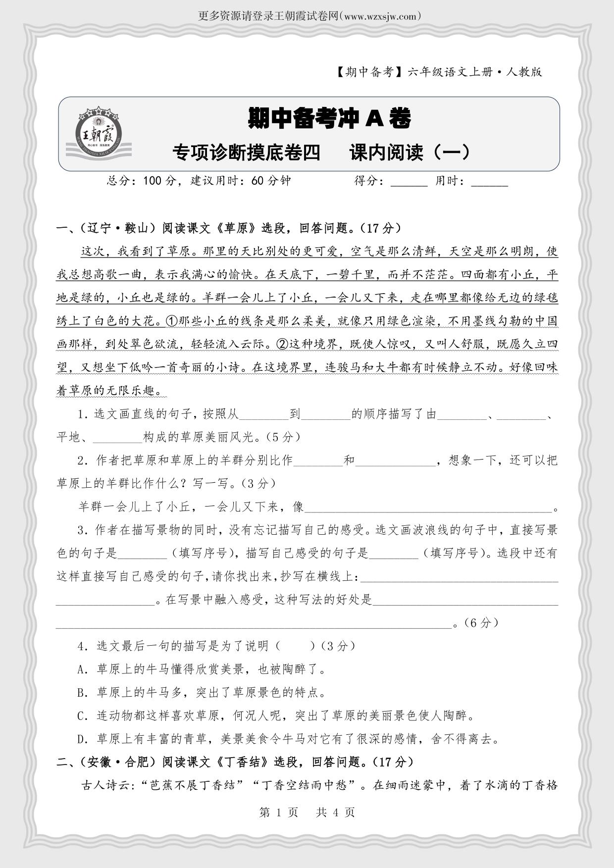 【期中备考】六年级语文上册人教版·专项诊断摸底卷四 课内阅读(一)